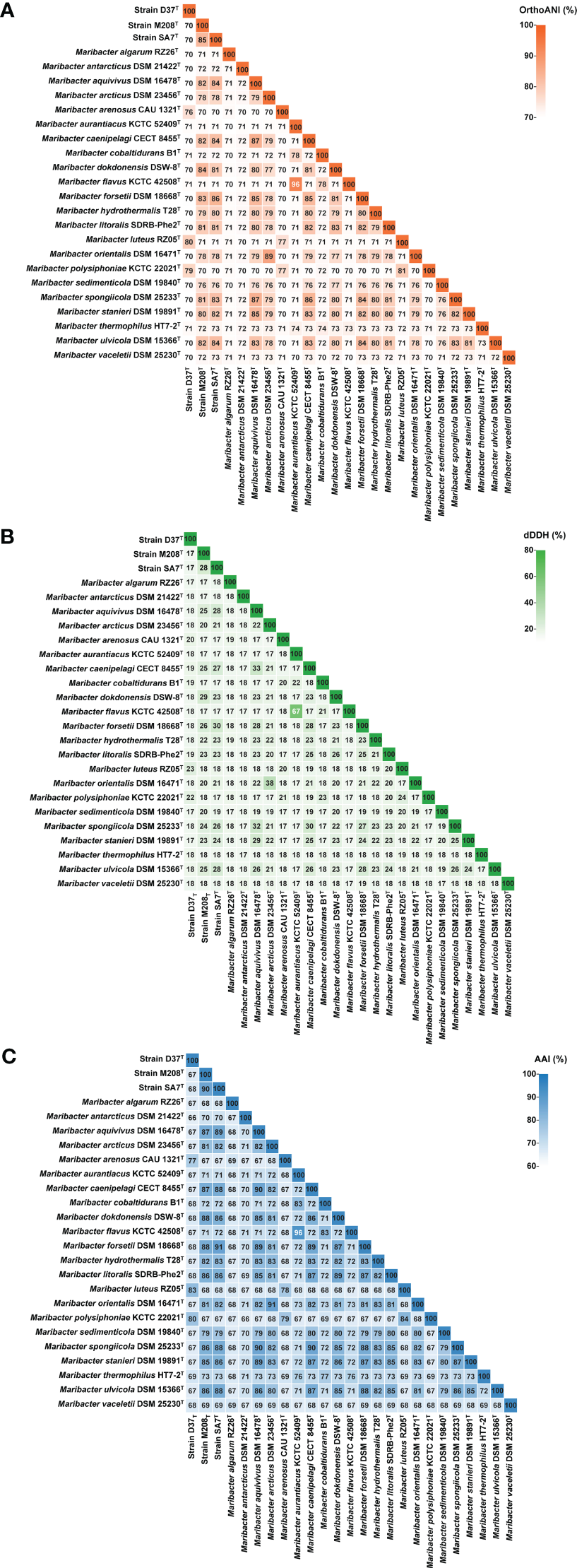 Although the highest similarity of 16S rRNA was higher than 98.65%, the value of recommended species delineation, their ANI, AAI, and dDDH were below the threshold. Together with the 16S rRNA gene and genomic phylogenetic analysis above, strains D37T, M208T, and SA7T could be assigned as the novel species of the genus Maribacter.