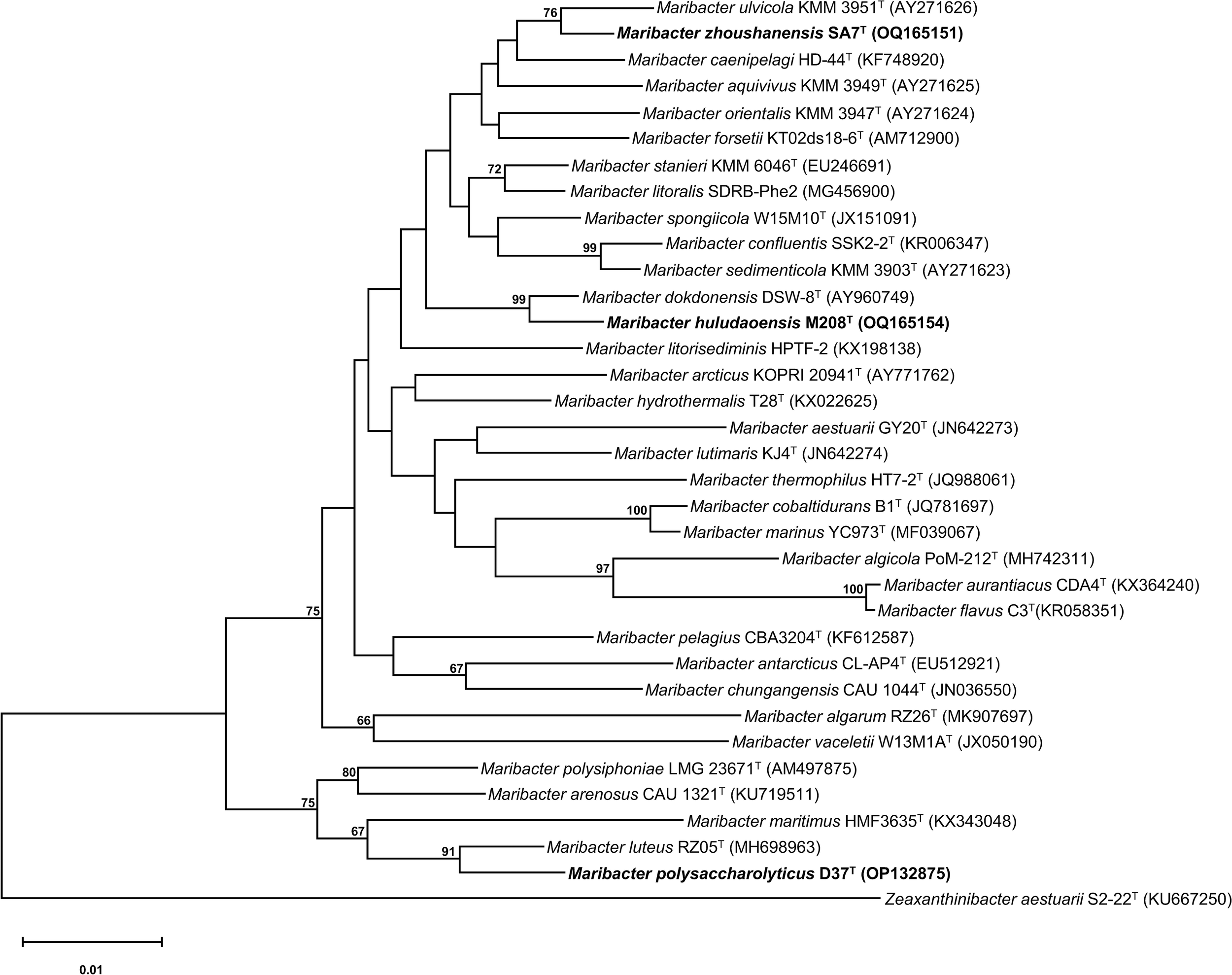 Figure 2 Neighbor-joining phylogenetic tree reconstructed with 16S rRNA gene sequences showing the relationships between strains D37T, M208T, and SA7T and related taxa. Filled circles indicate branches recovered with both two methods (neighbor-joining and maximum-likelihood). Bootstrap values are based on 1000 replicates and values less than 65% are not shown. Bar, 0.01 substitutions per amino acid position. Zeaxanthinibacter aestuarii S2-22T (KU667250) was used as an outgroup.
