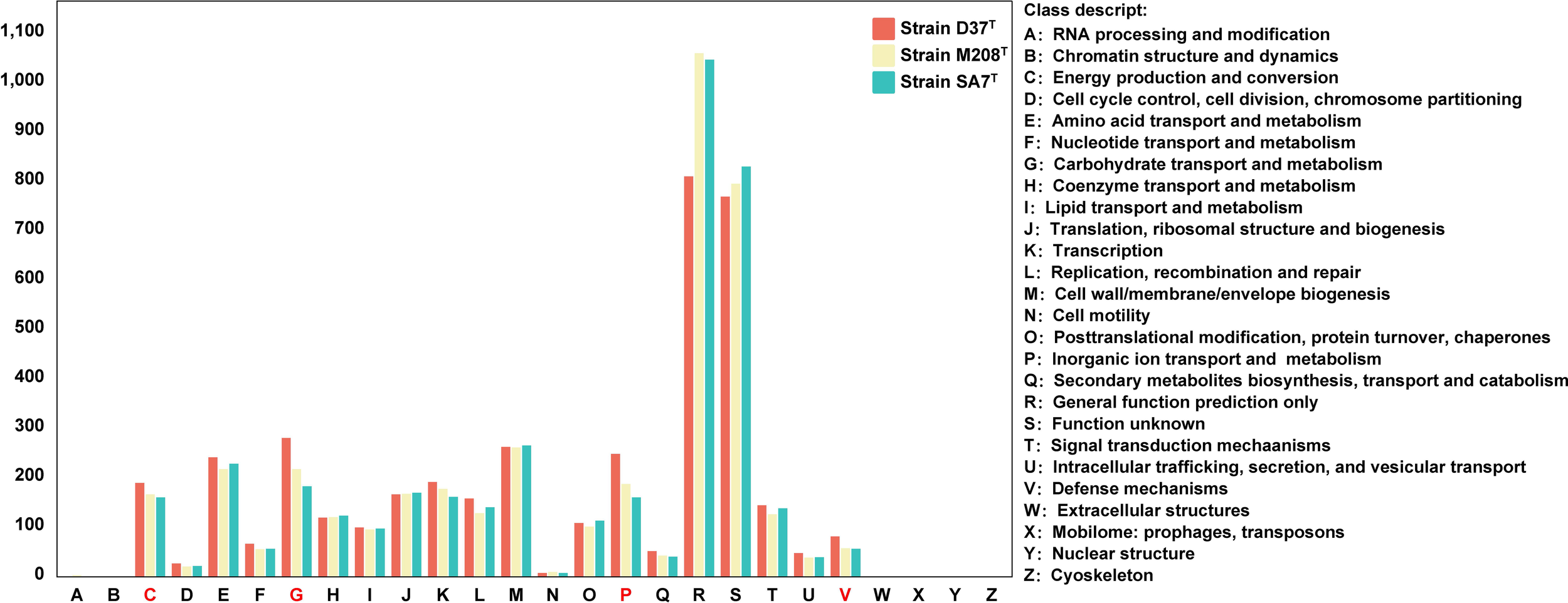 Figure 3 The annotation results of clusters of orthologous groups (COG) of the three novel strains. Groups in red means significant differences between three novel strains.