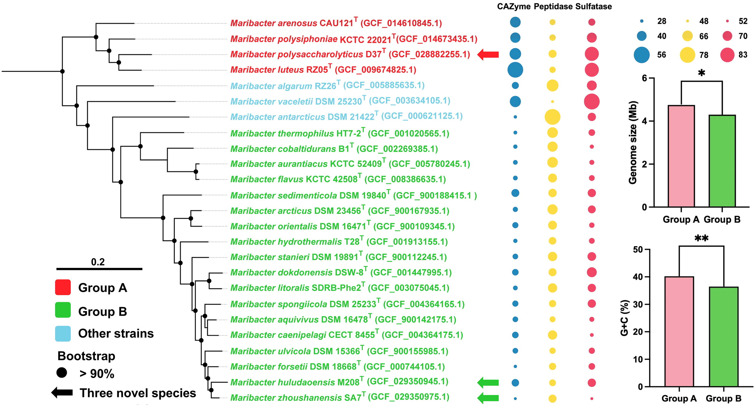 Figure 4 IQ-TREE reconstructed from single-copy orthologous protein sequences extracted from genome sequences showing the relationships between strains D37T, M208T, and SA7T and related taxa (left panel). Bootstrap values are based on 1000 replicates and values less than 90% are not shown. Bar, 0.20 substitutions per amino acid position. The arrows represent novel species proposed in this study. Group A strains are in red and group B strains are in green. The bubbles chart (middle panel) shows the ratios of CAZyme (blue), peptidase (yellow) and sulfatase (red) to genome size, respectively and the bubble size represents the size of the ratios. The bar chart (right panel) shows the genome sizes and G + C contents of strains in the two groups. *, significant (t-test, p < 0.05); **, very significant (t-test, p < 0.01).