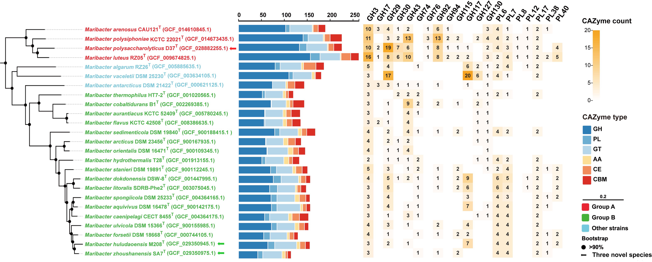 Figure 6 The phylogenomic tree based on single-copy orthologous protein sequences showing the relationships between strains D37T, M208T, and SA7T and related taxa (left panel). Bootstrap values are based on 1000 replicates and values less than 90% are not shown. Bar, 0.20 substitutions per amino acid position. The arrows represent novel species proposed in this study. The quantities and categories sum of CAZymes (middle panel) includes GH (dark blue), PL (blue), GT (light blue), AA (yellow), CE (orange), and CBM (red). The numbers and the shade (right panel) means the number counts and relative abundance of selected CAZyme families in twenty-five members of the genus Maribacter.