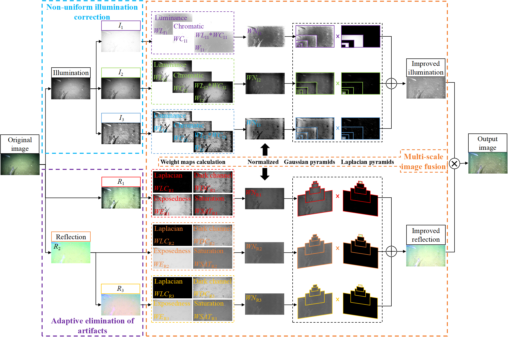The above research is mainly applied to the low light environment on land and has achieved certain results. However, the underwater environment is complex, water and suspended particles have absorption and scattering effects on light, and images taken in non-uniform illumination environments often have local overexposure or insufficient exposure. Especially in the process of enhancing low-light images, halo artifacts will be generated, resulting in unnatural image color and information loss. Therefore, a low-illumination underwater image enhancement method based on non-uniform illumination correction and adaptive artifact elimination is proposed. It is mainly composed of non-uniform illumination correction module, adaptive artifact elimination module, and multi-scale fusion module. First, in order to eliminate the influence of non-uniform illumination on underwater images, a non-linear guided filtering illumination equalization algorithm is designed to correct the non-uniform bright and dark areas of underwater images, and the dark channel prior theory and contrast-limited adaptive histogram equalization (CLAHE) algorithm are introduced to prevent the over-enhancement of images and the generation of dark areas. Then, aiming at the halo artifacts easily produced in the enhancement process, an adaptive multi-scale Retinex color fidelity algorithm with color restore (MSRCR) is proposed to improve the color of the image, and then, the gray world white balance algorithm is used to adjust the color distortion caused by the attenuation of light. Finally, we propose a multi-scale Retinex model parameter estimation algorithm to estimate the illumination component and reflection component and then obtain the enhanced underwater image according to Retinex model. The main contributions of this paper are summarized as follows: