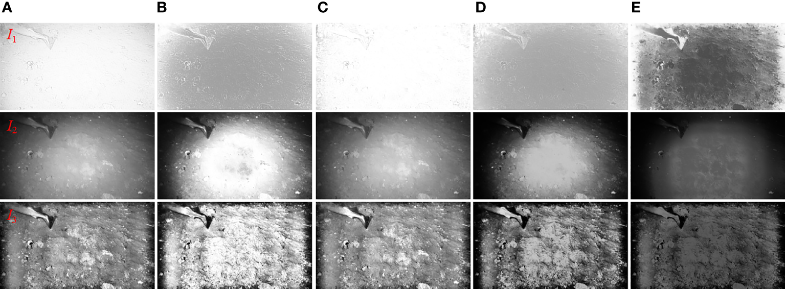 In order to accurately obtain the illumination component and reflection component of Retinex model, a multi-scale Retinex model parameter estimation algorithm is proposed. First, , , and obtained in the non-uniform illumination correction module are used as the inputs of the multi-scale image fusion module, and then, the brightness weight, color weight, and average weight of the corresponding input images are calculated, respectively, and then, the Laplacian values of the three input images and the Gaussian values mapped by the corresponding weights are calculated, and finally, the corrected illumination components are obtained by multi-scale fusion. At the same time, we use , , and in the artifact adaptive elimination module as the input of the multi-scale image fusion module and then calculate the Laplacian contrast weight, dark channel weight, exposure weight, and saturation weight of the input image, respectively (Fu et al., 2016). Then, we calculate the Laplacian value of the corresponding input image and the Gaussian value of the corresponding weight mapping. Finally, multi-scale fusion is performed to obtain the corrected reflection component. We use the corrected illumination component and reflection component and then get the enhanced underwater clear image according to the Retinex model.