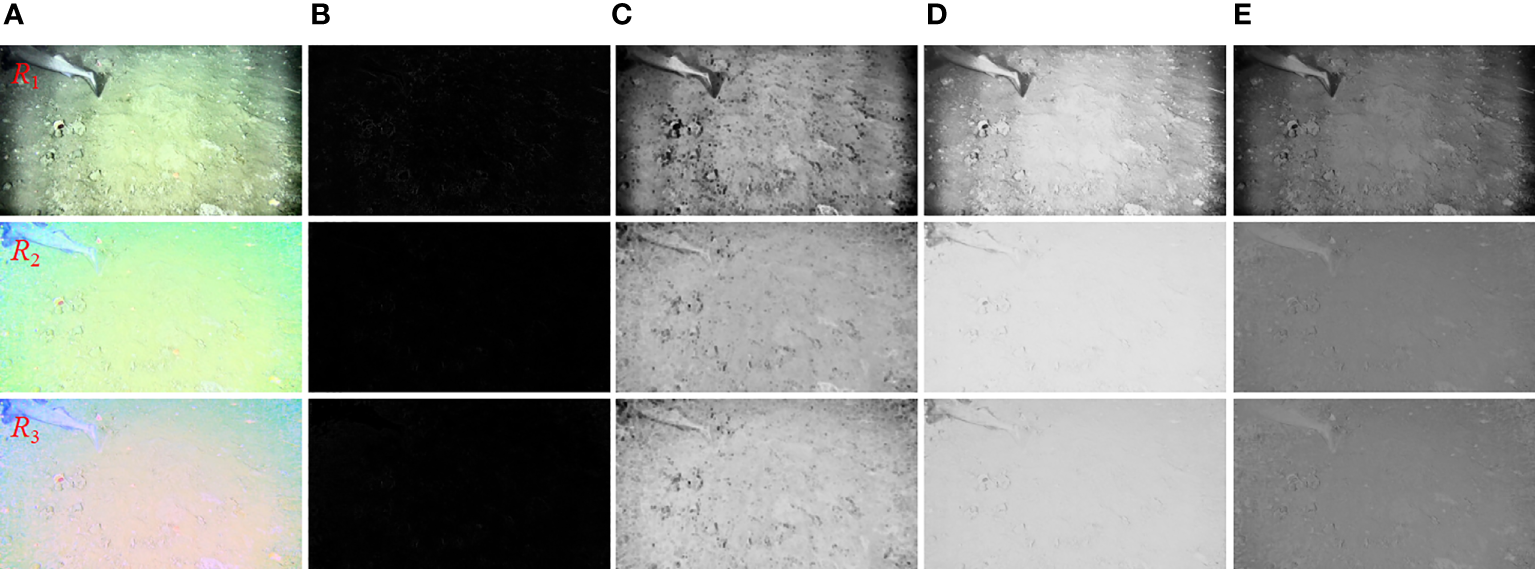 The image processed by the non-uniform illumination module is shown in Figure 4A. In order to accurately obtain the illumination component of the Retinex model, the selection of the input image weight map is particularly important. However, it is difficult to ensure that artifacts will not be introduced through simple pixel fusion. Therefore, we use a variety of weight maps in the fusion process so that pixels with high weight values can be displayed more. Brightness weight map is to distribute the pixel values in the areas with higher or lower brightness in the image evenly, so as to achieve the balance between color and contrast. The brightness weight diagram is shown in Figure 4B. However, for the non-uniform lighting environment, its weight value is not enough to enhance the underwater image, which has certain limitations. In order to solve this problem, we introduce chroma weight and control the image saturation gain by adjusting the ratio of input image to output image in color, as shown in Figure 4C. In order to keep the balance of illumination components in brightness and chroma, the fusion weights of brightness weight and chroma weight are calculated, and the fusion weight diagram is shown in Figure 4D. Finally, the three weight maps are summed and normalized to get the regularized weight, and the weight map is shown in Figure 4E.
