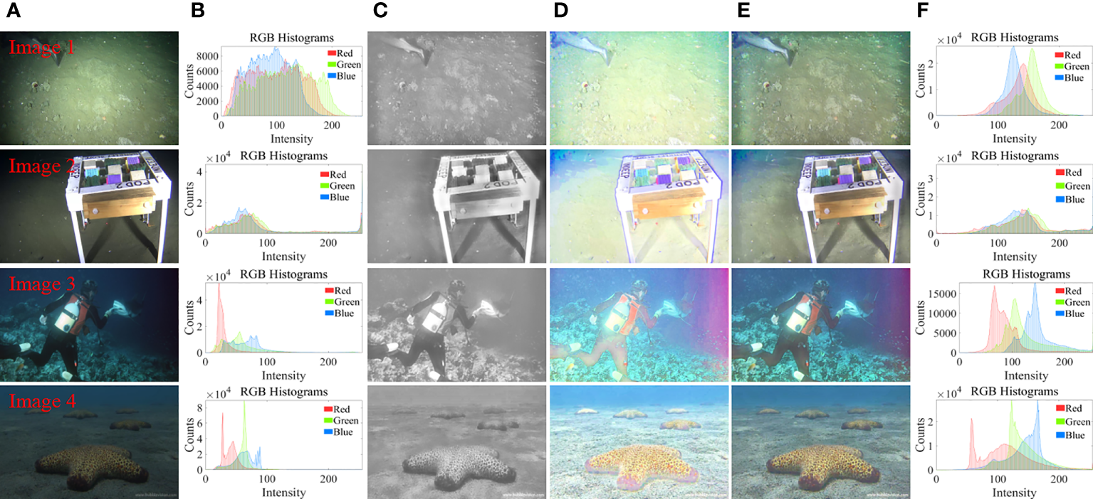 Using the modified illumination component and reflection component, the enhanced underwater clear image is obtained according to the Retinex model as shown in Figure 6. It can be seen from Figure 6E that the method in this paper can effectively correct non-uniform low-light underwater images. Comparing Figures 6B, F, it can be seen that the enhanced underwater image has a wider and more uniform RGB histogram distribution range. As shown in Figure 6C, the corrected illumination component eliminates the influence of non-uniform illumination to a certain extent. As shown in Figure 6D, the modified reflection component retains the color information of the image and ensures that the image does not have artifacts and color distortions.