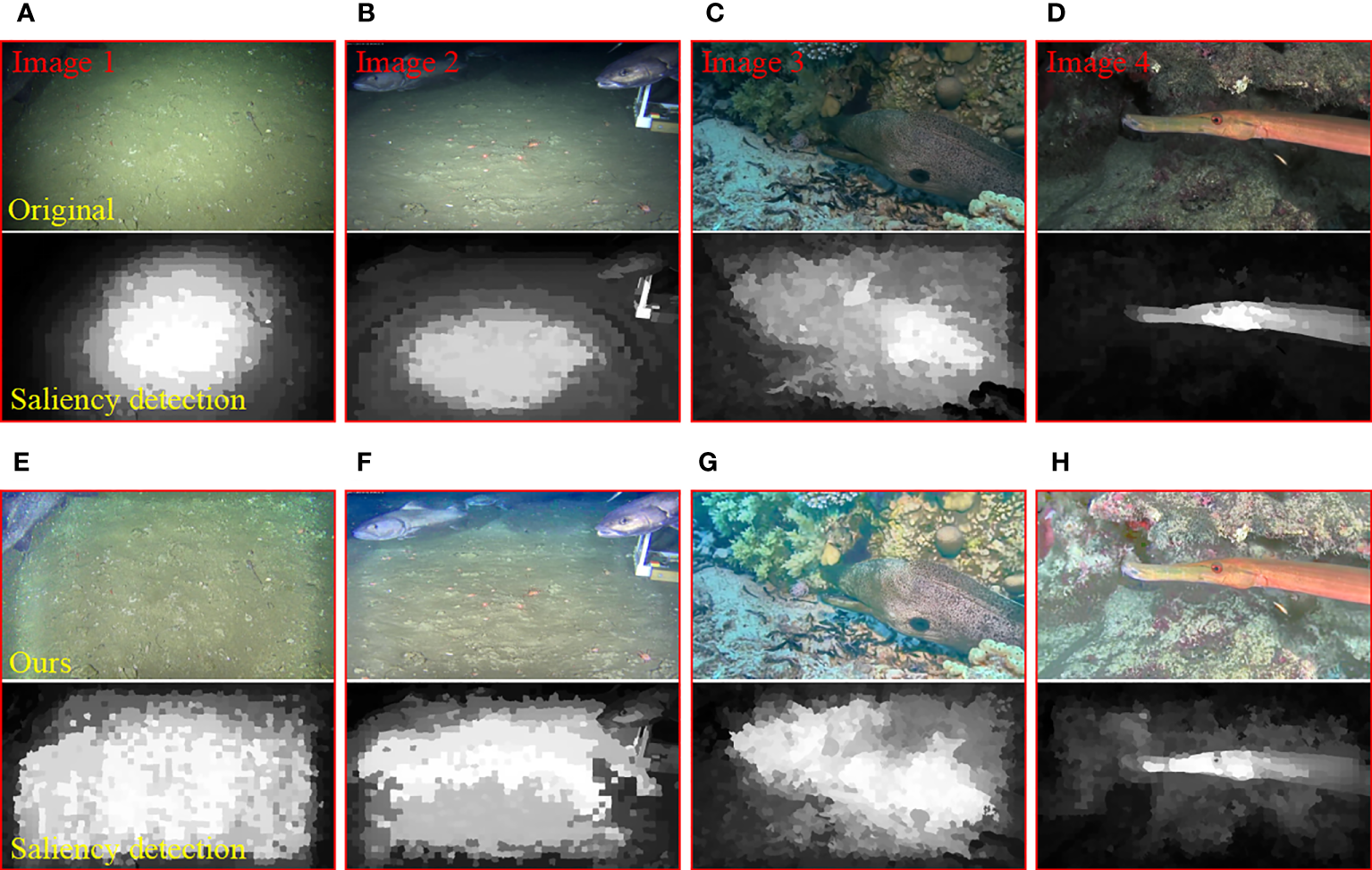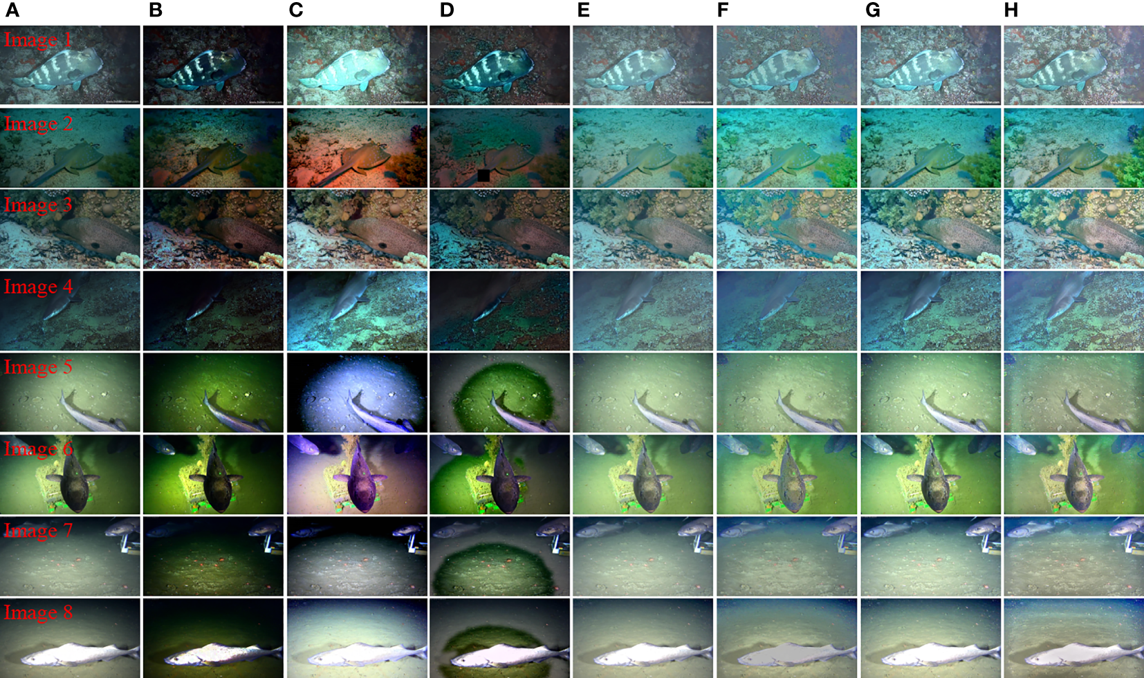 Qualitative comparison results of different algorithms in non-uniform illumination and dark area artifact environments. Panel (A) is an underwater original image; panel (B) is the processing result of UDCP algorithm; panel (C) is the processing result of IBLA algorithm; panel (D) is the processing result of WCID algorithm; panel (E) is the processing result of BIMEF algorithm; panel (F) is the processing result of FWE algorithm; panel (G) is the processing result of SDD algorithm; panel (H) is the processing result of the method proposed in this paper.