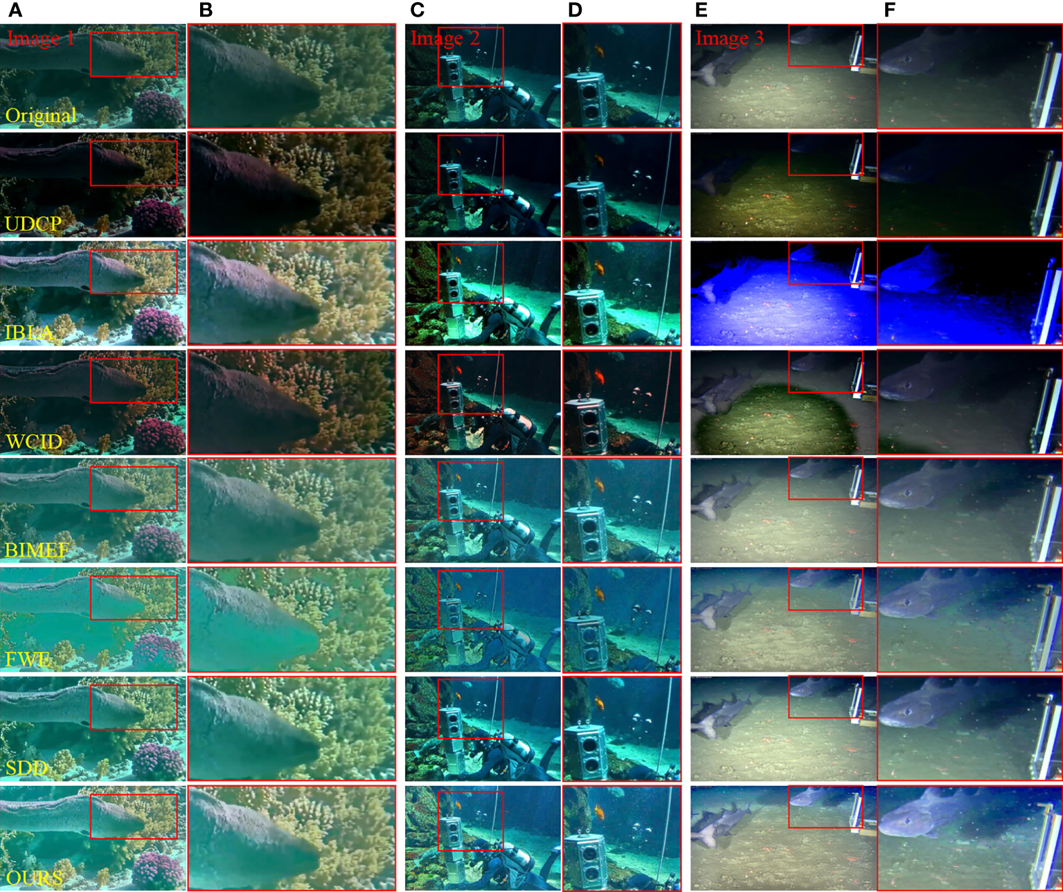 The detail enhancement ability of different algorithms in non-uniform illumination and dark area artifact scenes is compared. Panels (A), (C), and (E) are three underwater images in different scenes. Panels (B), (D), and (F) are the enlarged details in the red box on the left.