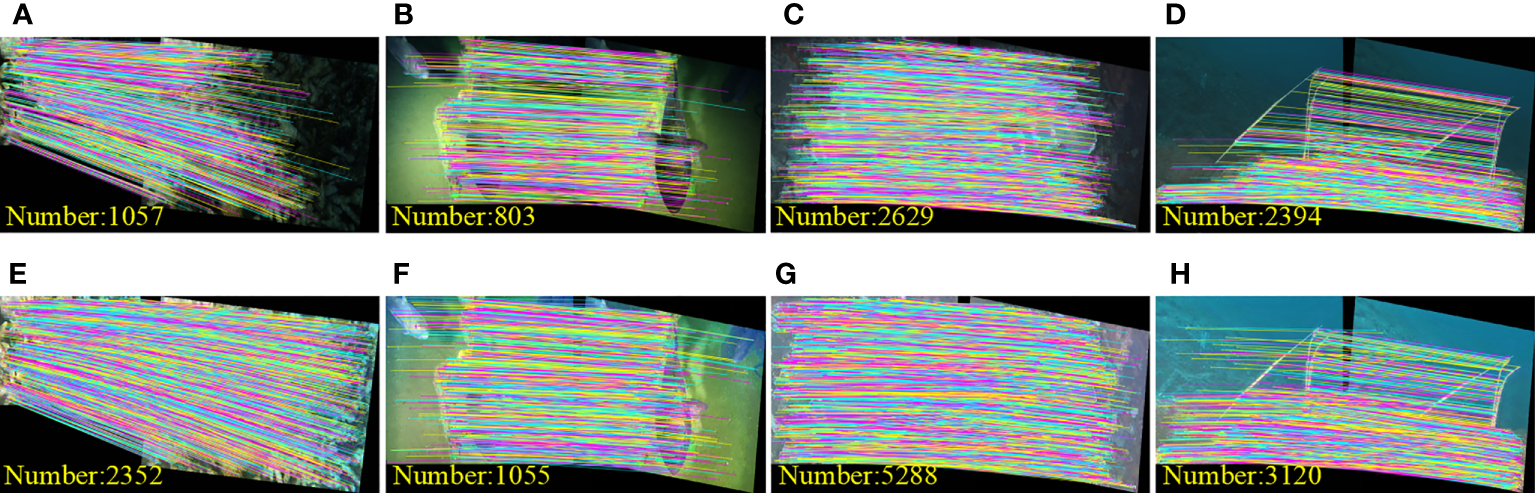 In order to verify the effectiveness of the method in this paper to restore underwater images in non-uniform illumination and low-illumination environments, we selected underwater low-light images with non-uniform illumination and dark area artifacts for testing. At the same time, by comparing with the existing classical underwater image enhancement techniques and analyzing from the aspects of contrast, visibility, and color restoration, the processing effects of each method are discussed. Due to the limitation of space, we only show some of the experimental results. The qualitative comparison results of different algorithms under non-uniform illumination and dark area artifact environment are shown in Figure 7. Figure 7A is an underwater original image, including images with non-uniform illumination and dark area artifacts. Figure 7B is the processing result of the UDCP algorithm. It can be seen that the contrast of all images is lower than that of the original image. At the same time, the red color deviation is introduced in Image3, and the green color deviation is introduced in Image5 and Image6, indicating that the algorithm does not accurately estimate the background light value of the underwater image. Figure 7C is the processing result of the IBLA algorithm. It can be seen from the figure that the contrast of all images has been improved, but each image has introduced different degrees of color deviation. Image1 and Image8 also have overexposure, indicating that the algorithm cannot accurately estimate the transmittance of the scene when processing non-uniformly illuminated underwater images. Figure 7D is the processing result of WCID algorithm. It can be seen from the image that there are artifacts in Image5–Image8, and the visibility of all images is not high. Figures 7E–G are the processing results of BIMEF, FWE, and SDD algorithms, respectively. These three algorithms have better effects on non-uniform low-light underwater images. The overall contrast of all images is greatly improved, and no color deviation is introduced. The visibility is also very good. However, these methods do not effectively restore the color of the image, and the edge of the image will still appear as dark area artifacts. Figure 7H is the processing result of the proposed method. It can be seen from the image that the contrast of all images is greatly improved compared with other algorithms, and there is no over-bright or over-dark area. At the same time, the contrast of the edge area of the image is also greatly improved, and the dark area artifacts of all images are eliminated. It shows that the proposed method can effectively deal with underwater low-light images and can also correct non-uniform bright and dark regions and ensure that the image does not appear artifacts and color distortion. Compared with the other six algorithms, the method proposed in this paper has good universality and is more suitable for underwater environments with non-uniform low-illumination and dark area artifacts.