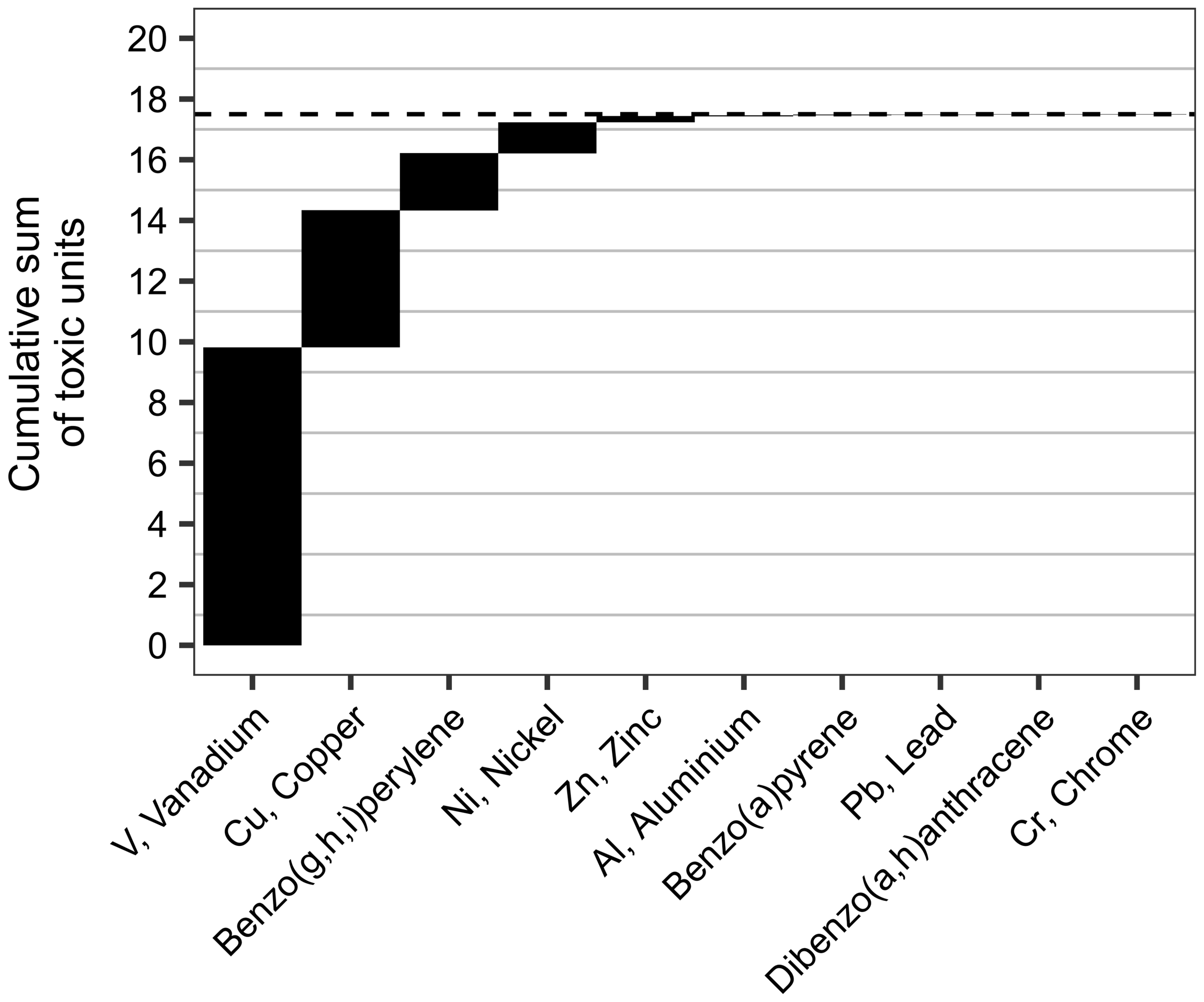 Ecotoxicity data was found for 19 out of the 25 detected individual metals and organic substances in the ECOTOX database, and the cumulative toxic unit (TU) for the combination of these in the undiluted CLSW was estimated to 17 (Figure 2). This corresponds to TUs of 0.26 and 0.5 for the 1.5% and 3% treatments respectively. Vanadium was the main toxicity-driver and contributed with 57% of the total toxicity followed by copper (26%), benzo[ghi]perylene (BghiP) (11%) and nickel (5%). These four substances were together responsible for >99% of the total toxicity of the CLSW based on the detected individual chemicals.