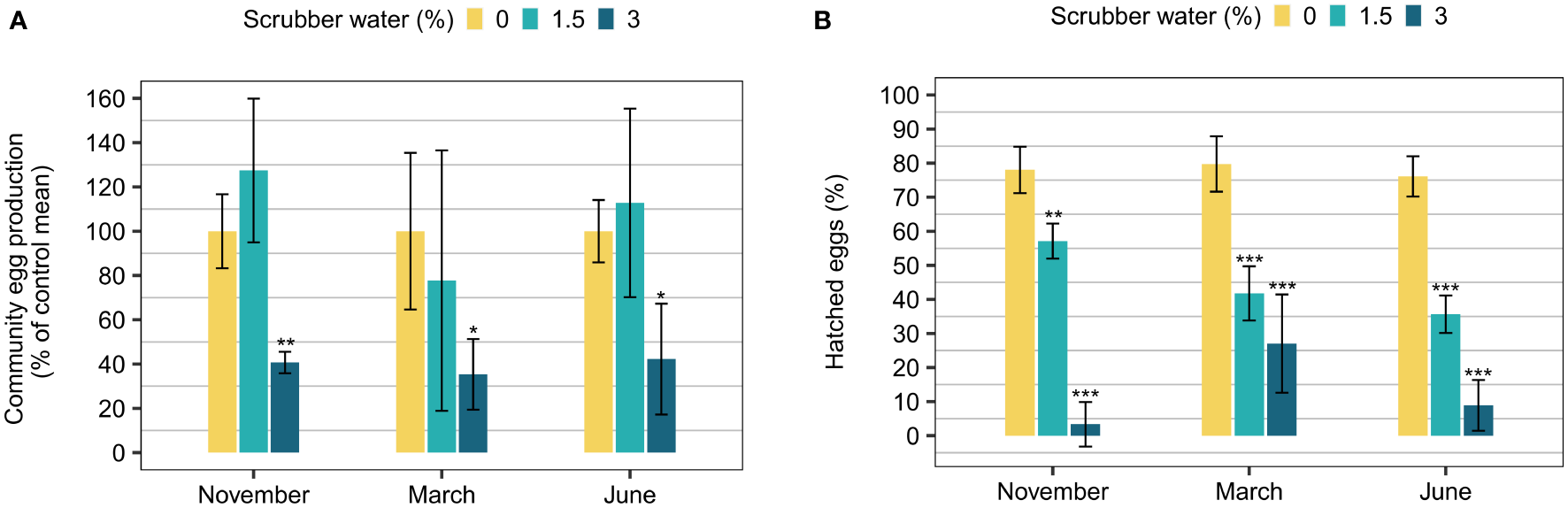 Figure 3 Effects of closed-loop scrubber washwater on copepod reproduction during all three seasons. (A) Copepod community egg production shown as % of control mean (mean ± 95% confidence interval, n=5), and (B) hatching success displayed as % hatched eggs of the total amount of eggs produced during the exposure (mean ± 95% confidence interval, n=5). The mean copepod community egg production was 452, 103, and 734 respectively for the months November, March, and June. The asterisks above the bars indicate significant differences from the respective control (0%) treatments (p-values:<0.001 ‘***’,<0.01 ‘**’,<0.05 ‘*’).
