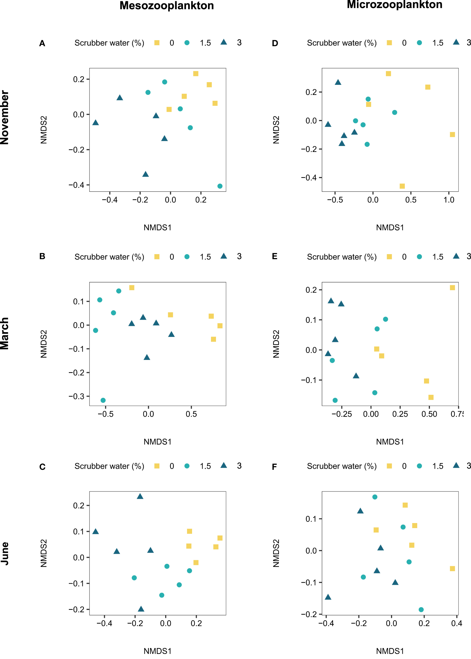 Figure 5 NMDS visualizing community diversity during each month for mesozooplankton in (A) November, (B) March, and (C) June, and for microzooplankton in (D) November, (E) March and (F) June. Distances are based on Bray-Curtis dissimilarity using non-transformed percentages of taxa in each sample.