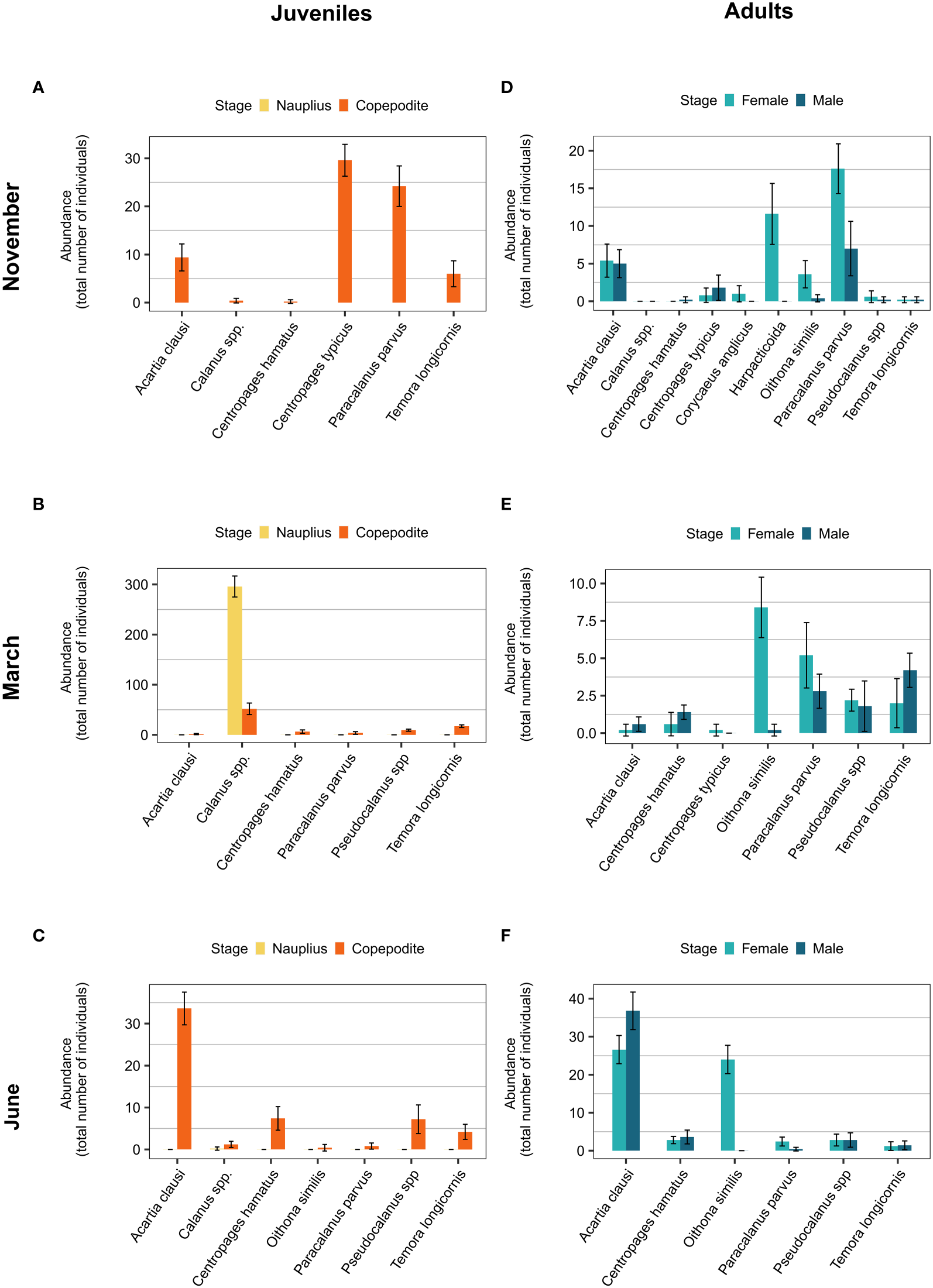 Figure 6 Abundances (ind/L-1) of the respective taxa at the start of the respective experiments. (A) Juveniles in November (B) juveniles in March (C) juveniles in June (D) adults in November (E) adults in March, and (F) adults in June. Bars show mean ± 95% confidence interval.