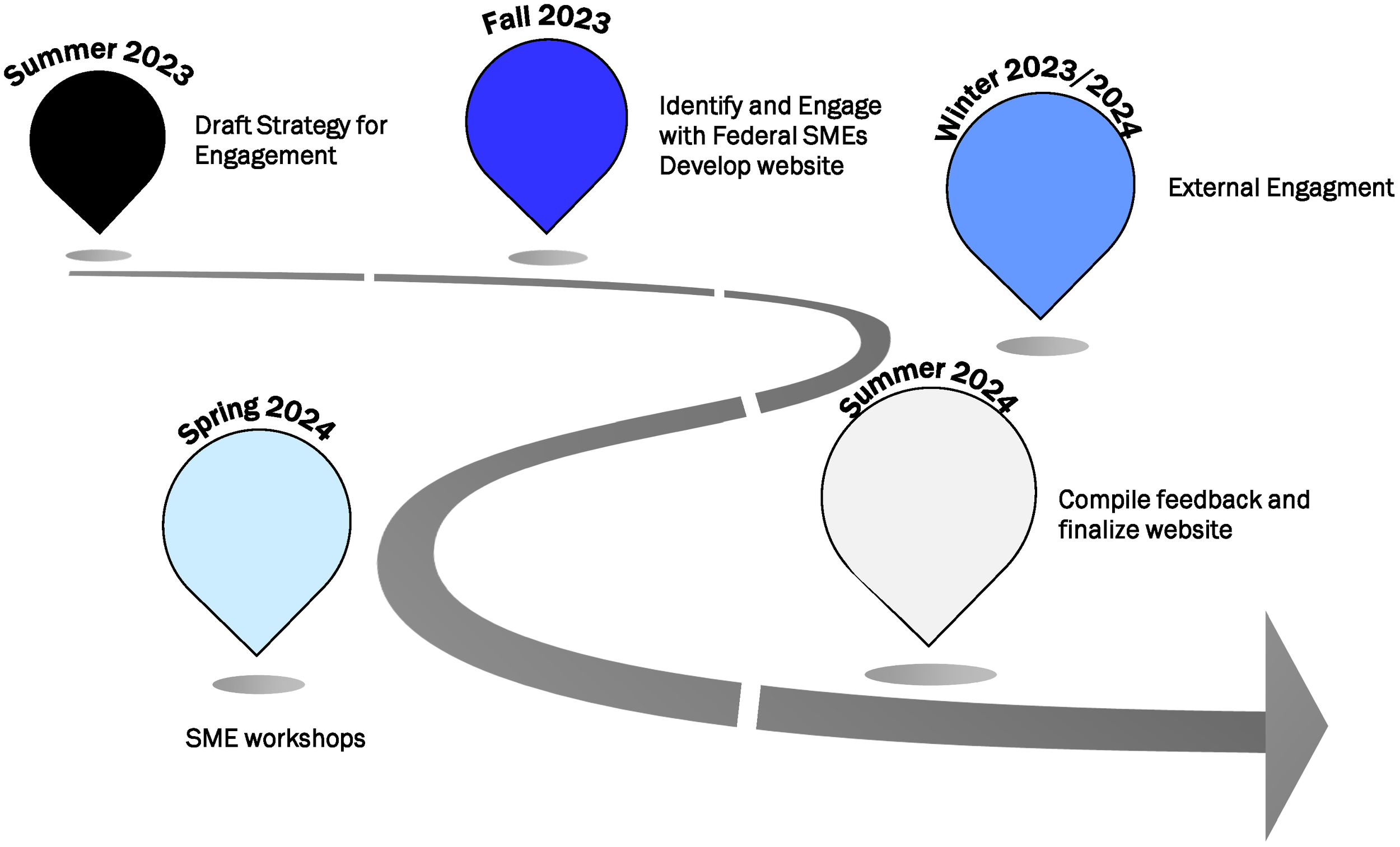 Tentative timeline for the goals of the Interagency Working Group - Ocean Exploration and Characterization (IGW-OEC); starting in June 2023 and ending next year in July 2024. Plans for summer of 2023 will focus on the development of a strategy for engagement to develop the resource repository, followed by initial engagement with federal subject matter experts (SMEs) in the Fall of 2023. External engagement begins during the Winter of 2023/2024, casting a broad net to gather input from non-governmental stakeholders. A series of workshops to refine input are planned for the Spring of 2024, culminating in the public launch as an online repository by Summer 2024.