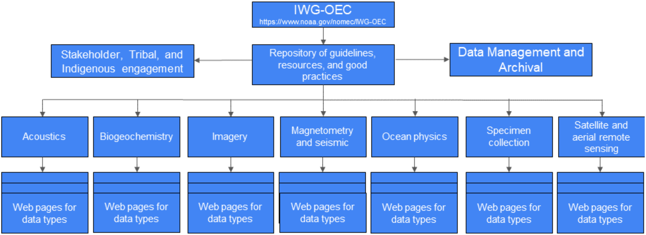 Once aggregated, we plan to publicly host the federal resources on the NOMEC IWG-OEC website in a searchable and accessible format as the initial framework of the repository. The disciplinary categories identified in the Strategic Priorities for Ocean Exploration and Characterization report (IWG-OEC, 2022, p.20) can be partly used to help guide the development of the initial framework along with the nested subcategories shown in Figure 2 (e.g., acoustics). A government hosted website can serve as an authoritative resource for broader communities, both domestic and international. The website nesting format (Figure 2) also allows for the flexibility to adapt and add to future exploration and characterization data categories, cross-link relevant documents, and inventory protocols and standards across the diverse fields of ocean exploration and characterization. Once initial input from federal agencies is received and subject matter experts are identified, the IWG-OEC plans to host a series of focused discussions to solicit external (non-federal government) stakeholder contributions to the repository.