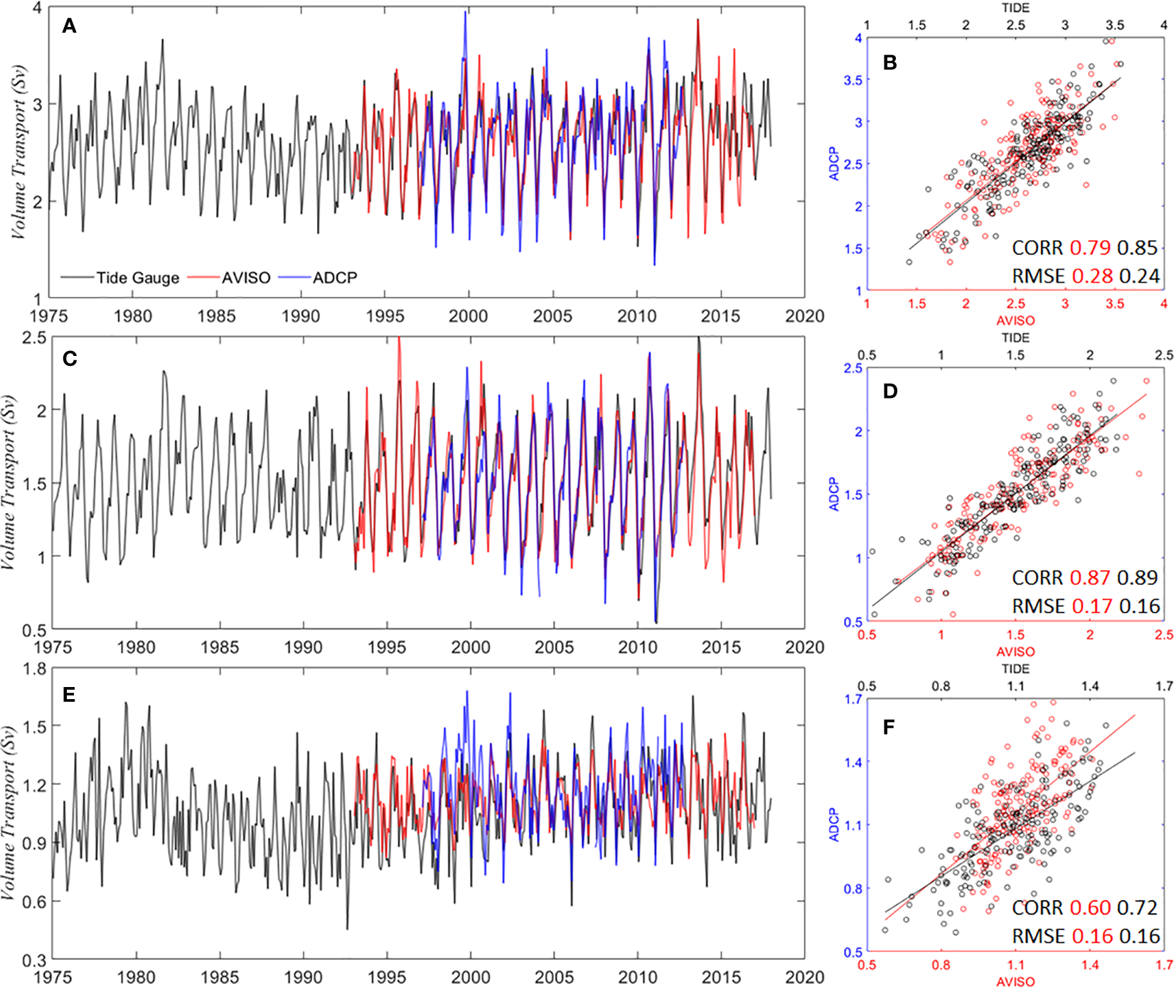 (Left panels) Monthly volume transport (Sv, 1Sv = 106 m3 s–1) of the Tsushima Warm Current from 1975 to 2017 estimated from sea level differences (SLD) using Eq. (1) (black lines): (A) the Korea/Tsushima Strait (KTS), (C) the western channel and (E) the eastern channel. Blue and red lines indicate the monthly volume transports measured by ferry-mounted ADCP for 1997–2012 and estimated from altimetry-based sea level anomalies (SLA) for 1993–2017, respectively. Comparison of SLD-estimated volume transports with altimetry-based SLA (red) and the ferry-mounted ADCP (blue) volume transport: (B) the KTS, (D) the western channel, and (F) the eastern channel. SLD-estimated transport is shown by black dots in (B, D, F).