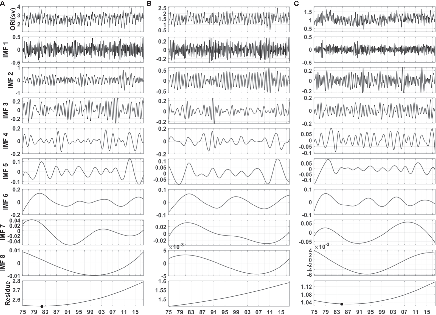EEMD decompositions of monthly volume transports through (A) the Korea/Tsushima Strait, (B) the western channel and (C) the eastern channel estimated from sea level differences across the straits. Original monthly data (top) are decomposed into eight IMFs from high to low frequency and resulting trends (bottom panels) by EEMD analysis. Black circles indicate the shifting years of the EEMD-derived trend.