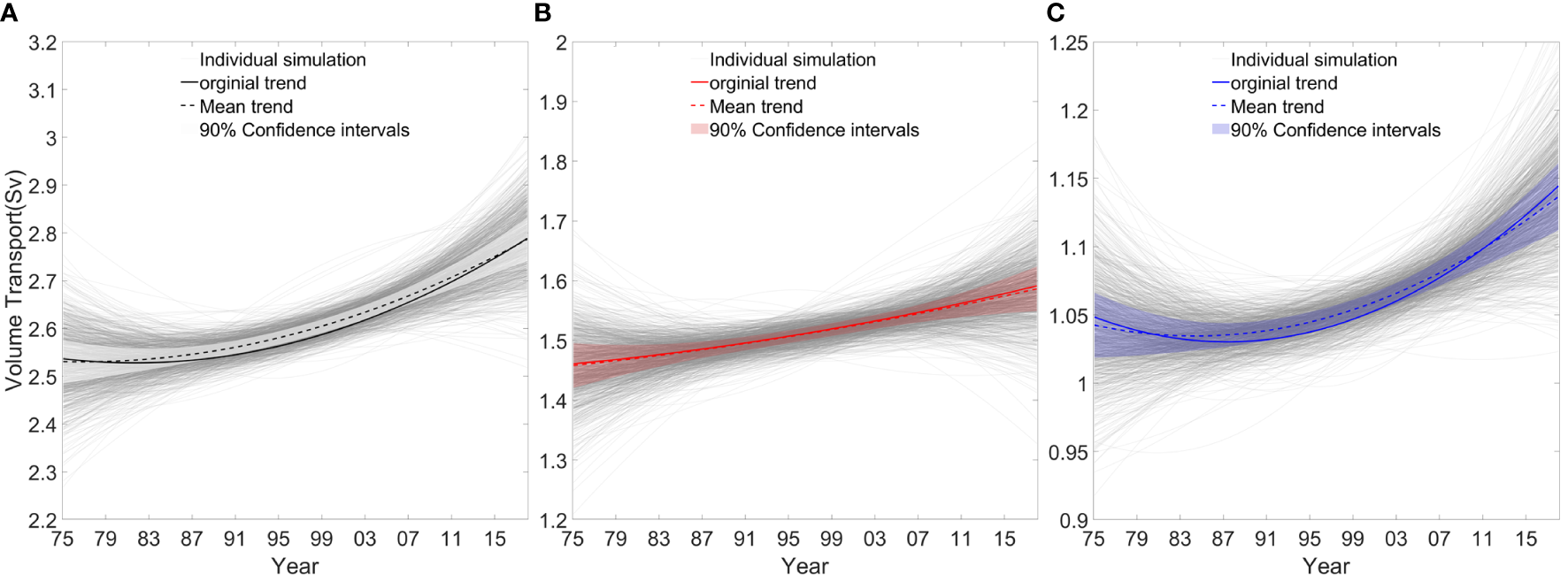 Time-varying trends from EEMD analysis of volume transport (Sv, 1Sv = 106 m3 s–1) estimated from sea level differences with bootstrap simulations (M = 1000 iterations) for the significance test: (A) the Korea/Tsushima Strait, (B) the western channel and (C) the eastern channel. The thin gray lines indicate all simulated individual trends. The solid and dashed lines are the trends of the original data mean and artificial mean, respectively. The 90% confidence intervals are shown by the shaded areas.