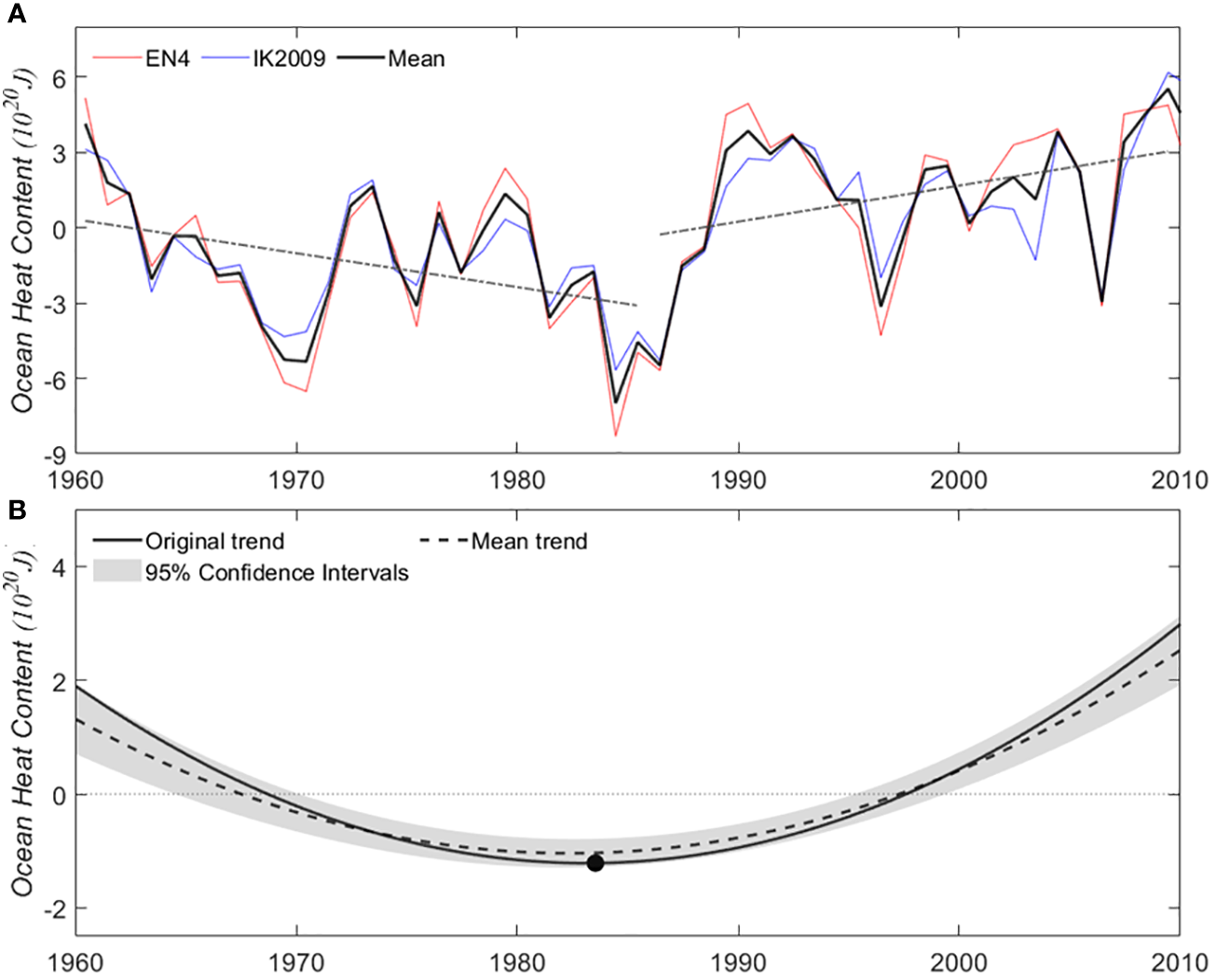 (A) Time series of upper 300 m ocean heat content (OHC) anomaly in the East/Japan Sea (EJS) derived from in situ-based IK2009 (blue) and EN4 (red line) datasets from 1960 to 2010. The linear trend lines for 1960–1985 and 1986–2010 are also presented (dashed lines). (B) Time-varying trend from EEMD analysis of EJS OHC. Solid and dashed lines are the trend of original data mean and artificial mean, respectively. The 95% confidence intervals are shown by the shaded areas. Black circle indicates the shifting year of the EEMD-derived original trend.