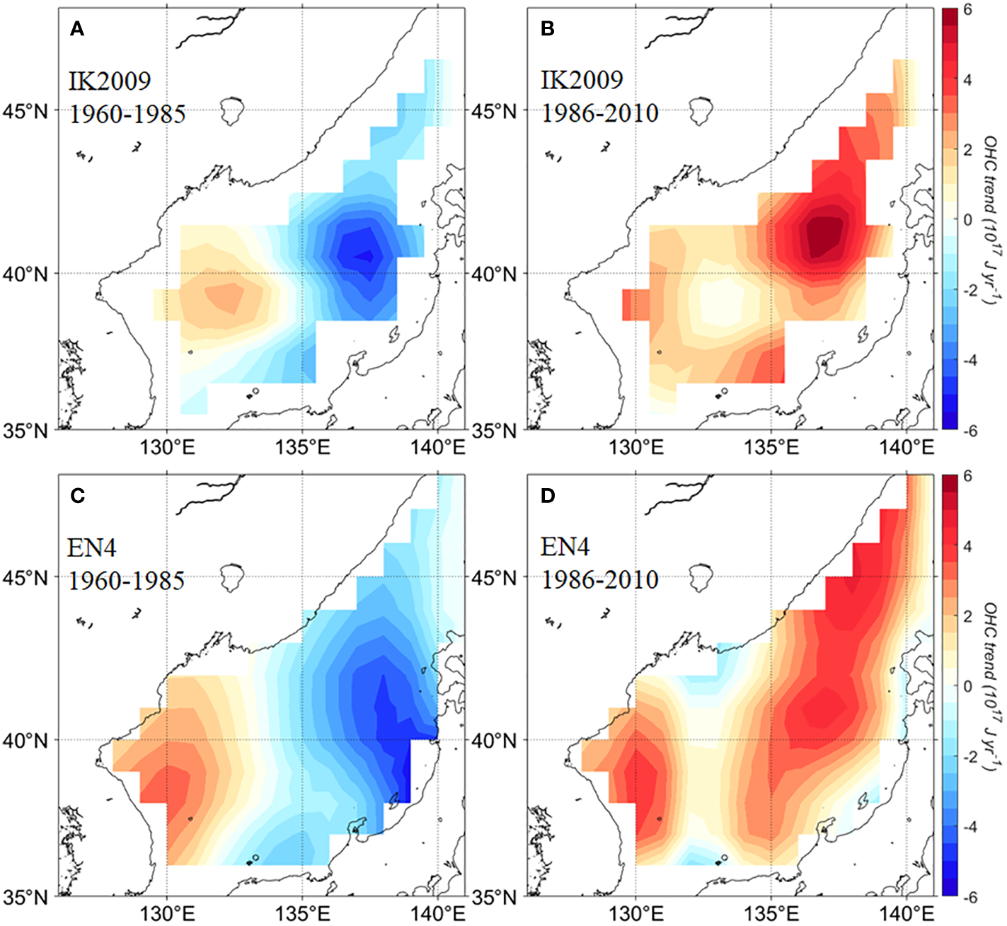 Spatial trends of OHC in the uppermost 300 m depth of the EJS derived from IK2009 (upper) and EN4 (lower panels) datasets over two periods: (A, C) 1960–1985 and (B, D) 1986–2010.