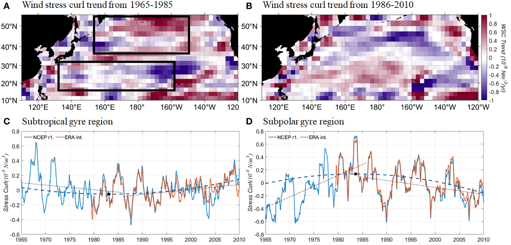 (A, B) Trends of wind stress curl derived from NCEP reanalysis product over multi-decadal period, i.e., 1965-1985 and 1986-2010. Time series of mean wind stress curls anomalies over the North Pacific at (C) mid-latitudes [subtropical gyre region shown by southern box in (A)] and (D) high-latitudes [subpolar gyre region shown by northern box in (A)] from the reanalysis products of NCEP (blue) and ERA interim (red). The multi-decadal linear trends (thin lines) and EEMD-derived trends (dashed lines) are also presented. Black circles indicate the shifting points of the EEMD-derived trends.