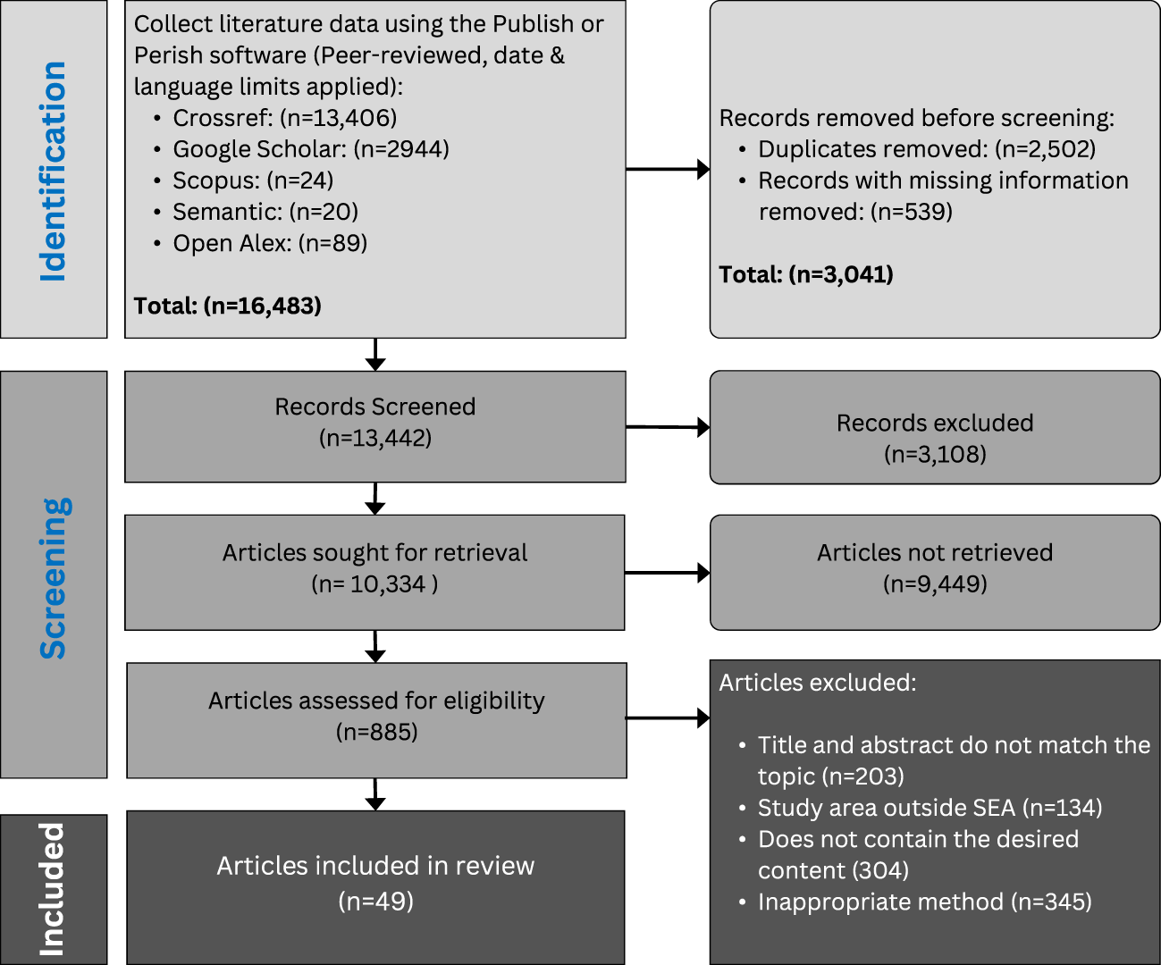 The initial data obtained after conducting a literature search using the specified keywords yielded a total of 16,483 journal articles and reports. Subsequently, data screening was performed using Microsoft Excel, which revealed 2,502 duplicate articles (15.18%), resulting in 13,981 remaining articles. Among these articles, some had missing information in terms of authorship, title, or inaccessible literature links. The literature entries with missing information (blanks) accounted for 539 articles (3.27%), resulting in a final dataset of 13,442 articles. The final selection involved examining the titles and abstracts of the nonduplicate and nonblank entries. A total of 13, 393 articles (81.25%) were not relevant to our research topic, leading to the utilization of only 49 articles (0.30%) in the final analysis (Figure 1).