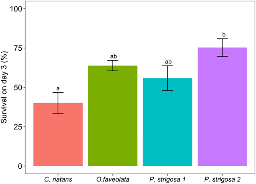 Percentage (%) of coral larvae surviving on day 3 for all species under all treatments. Survival counts include swimming larvae, settled coral recruits (both on tiles and inside of chamber), and larvae which had metamorphosed while floating in the water column. Data presented as mean percentage of the original 50 larvae placed inside each chamber. Error bars show ±1 standard error and letters show Tukey posthoc comparsions. Letters displayed over bar plots show significant differences between treatments.