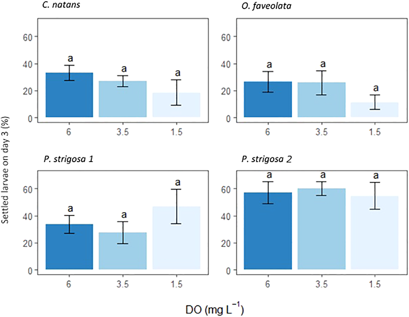 Settlement occurred in all chambers. Rates of settlement were species-specific (ANOVA F10.86, p <0.0001), with no significant interaction between species and DO treatment (Table 3). DO treatment did not have a statistically significant effect on settlement (Figure 3; Table 3). Settlement rates were highest in the second batch of P. strigosa in all treatments (57.3 ± 4.2%) and lowest in O. faveolata (21.3 ± 4.4%).