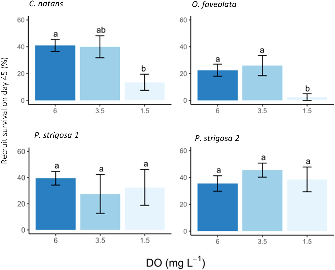 Coral recruit survival after 42 days of post-settlement deoxygenation exposure (45 days total including 3 days of exposure during larval phase) presented as % of initial 50 larvae placed in each chamber. A two-way ANOVA found that both species and treatment had p-value <0.05. C. natans and O. faveolata showed lower recruit survival in the 1.5 mg L-1 DO treatment than P. strigosa, which was not affected by deoxygenation treatment. Error bars show ± 1 standard error and letters above bars show Tukey post-hoc tests conducted on each species. ANOVA results are in Table 3.