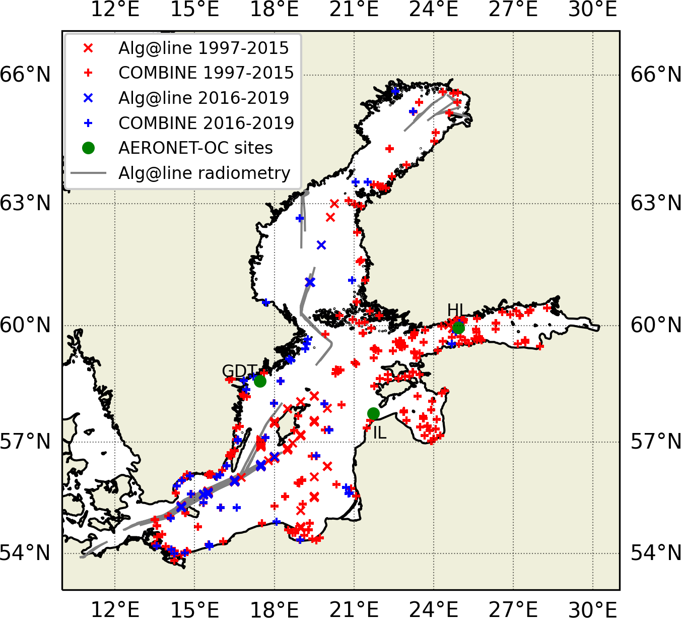 Study area showing the location of the in-situ measurements. The crosses identify the in-situ Alg@line chl-a data collected by the SYKE, whereas the pluses are chl-a data extracted from the COMBINE database (red points: 1997–2015; blue points: OLCI period from 2016 to 2019) (Section 2.2.2). The green dots mark the location of the AERONET-OC sites (GDT, Gustav Dalen Tower; HL, Helsinki Lighthouse; IL, Irbe Lighthouse; Section 2.2.1). Gray lines show the trajectories of the ships during the collection of the Alg@line shipborne radiometry data by SYKE in 2016 (Section 2.2.1).