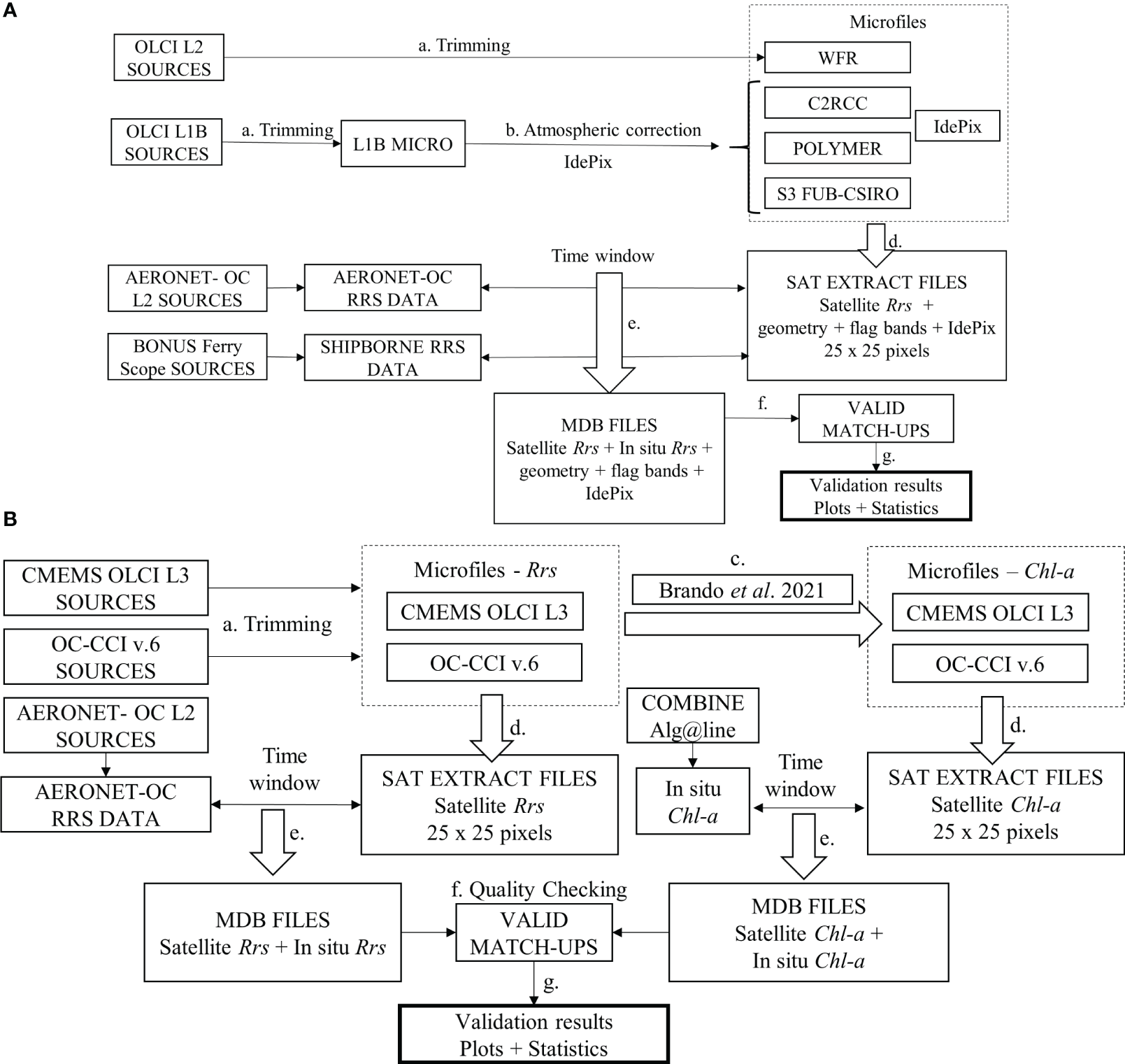 d) Generation of satellite extract files: Level-2 extract files (Figure 2A) were created for the Sentinel-3A or Sentinel-3B mission and each AC processor (WFR, POLYMER, C2RCC, and S3 FUB-CSIRO) starting from the corresponding output microfiles. Each extract file contains 25 × 25 pixels of satellite data centered at the site location (for AERONET-OC) or transect point(s) (for shipborne radiometry). These files include always Rrs for all the available bands, geometry (zenith and azimuth observation and sun angles), the flag band corresponding to the processor (see Section 2.1.1), and the IdePix results. If output values are defined as water-leaving reflectance (WFR and POLYMER), they are converted to Rrs by dividing by pi. The satellite overpass time and band wavelengths are also included in the files.