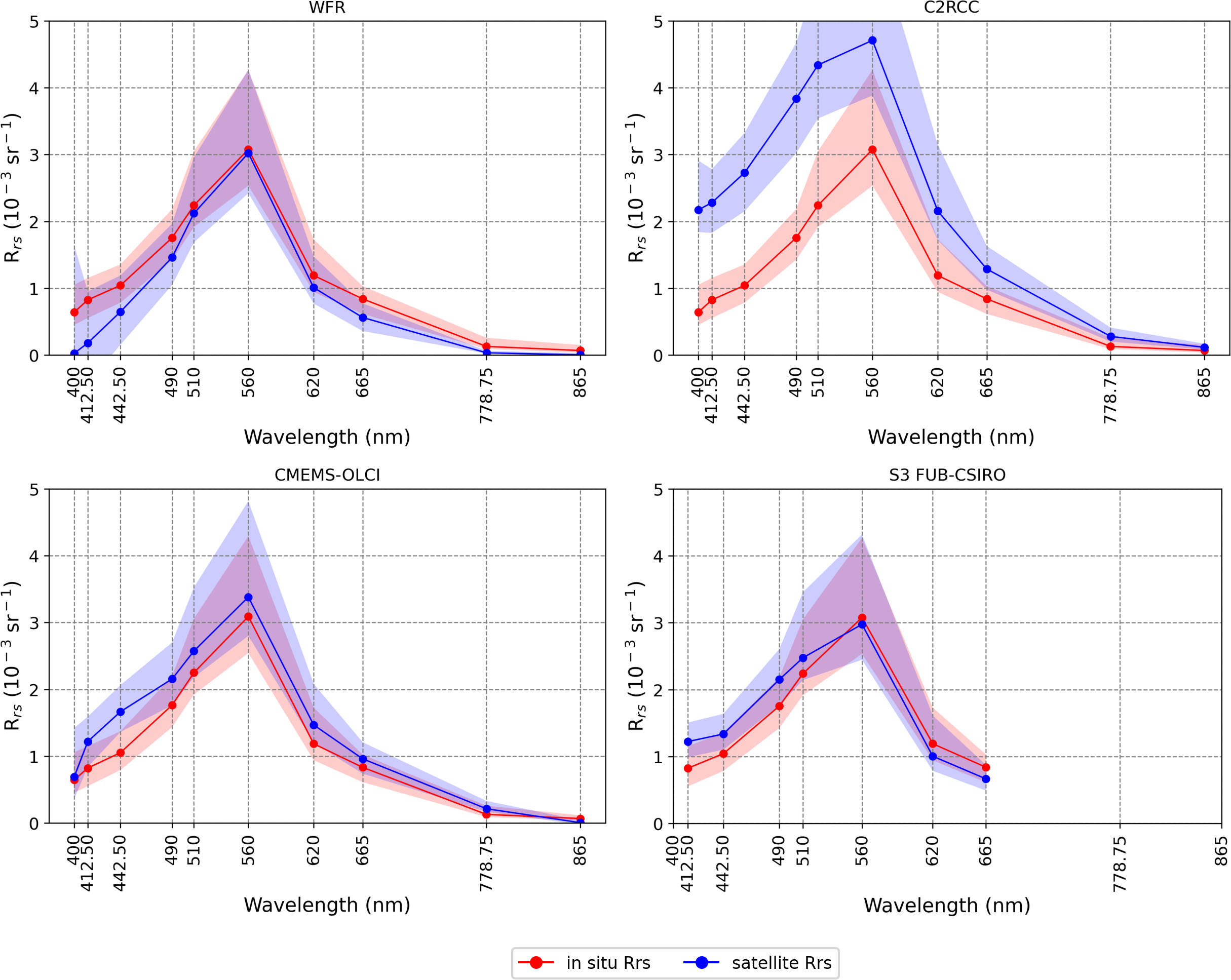 For the validation of satellite-derived Rrs, this study relies on two sources of in-situ automated above-water radiometry: the AERONET-OC and the Alg@line hyperspectral datasets were collected following the same above-water radiometry approach (Zibordi et al., 2009; Simis and Olsson, 2013).
