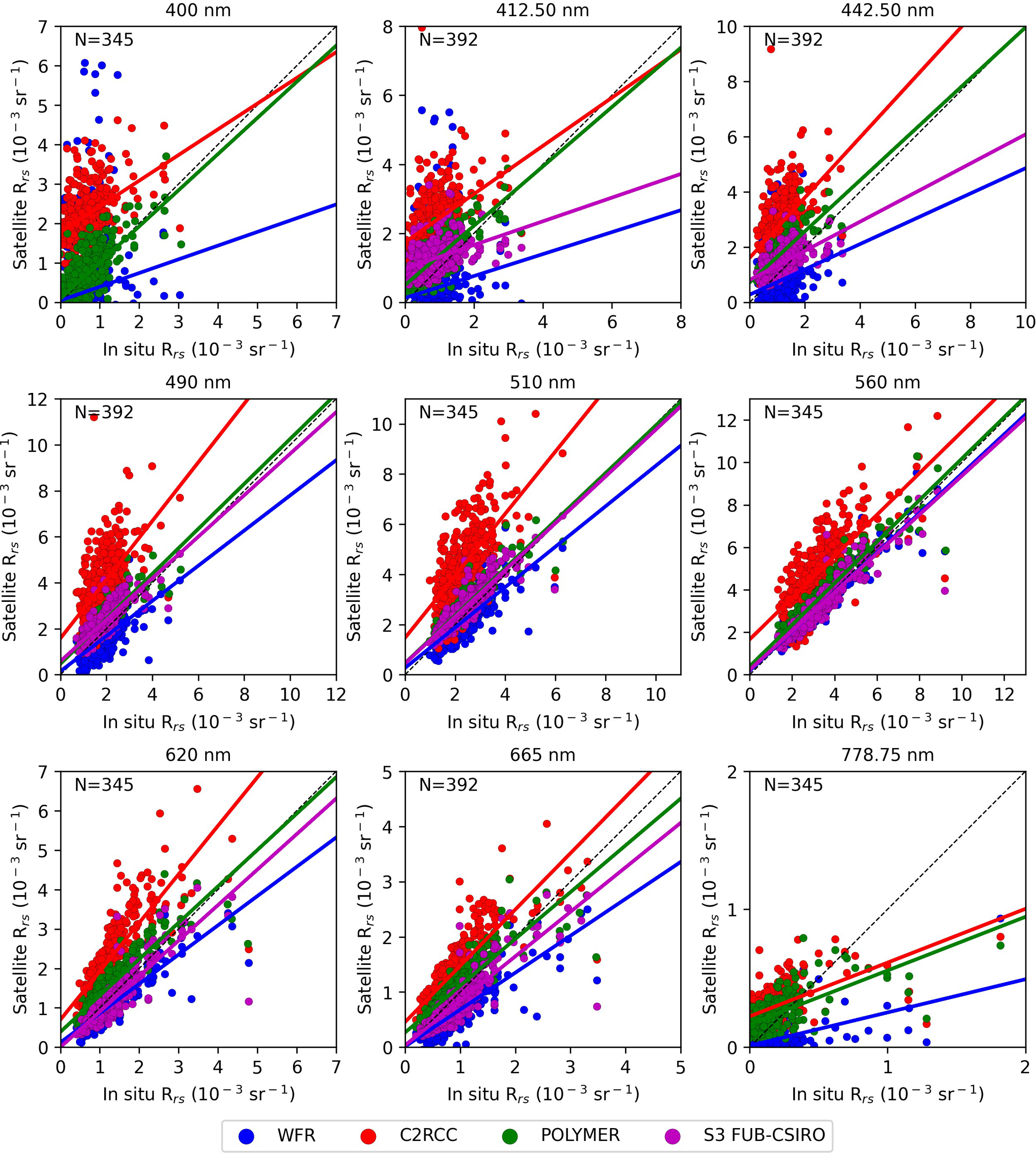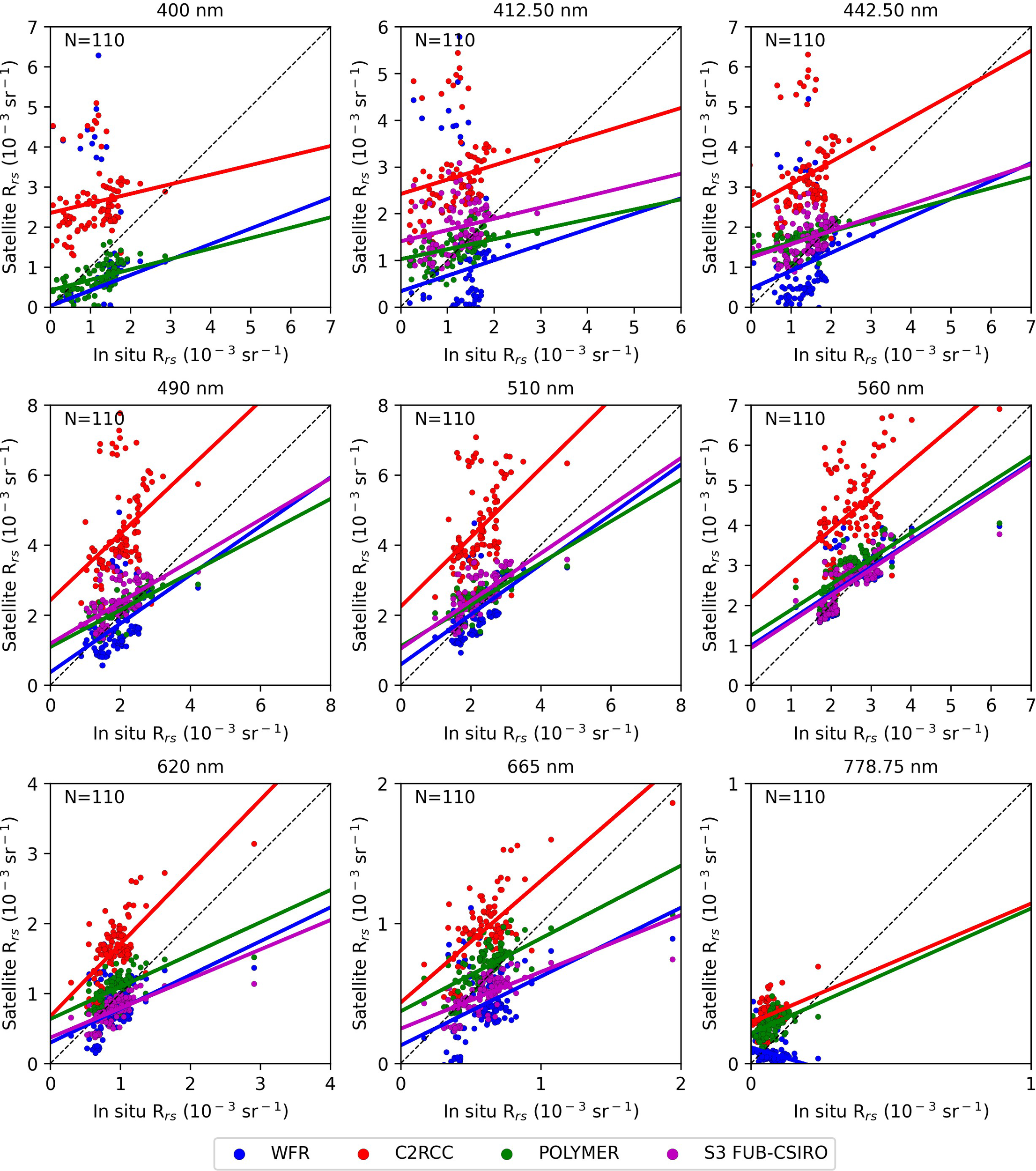 | Satellite bands | AERONET-OC bands | |||||