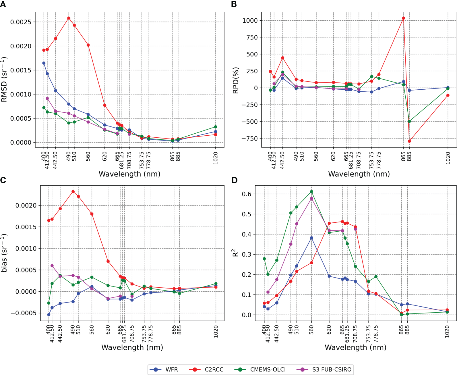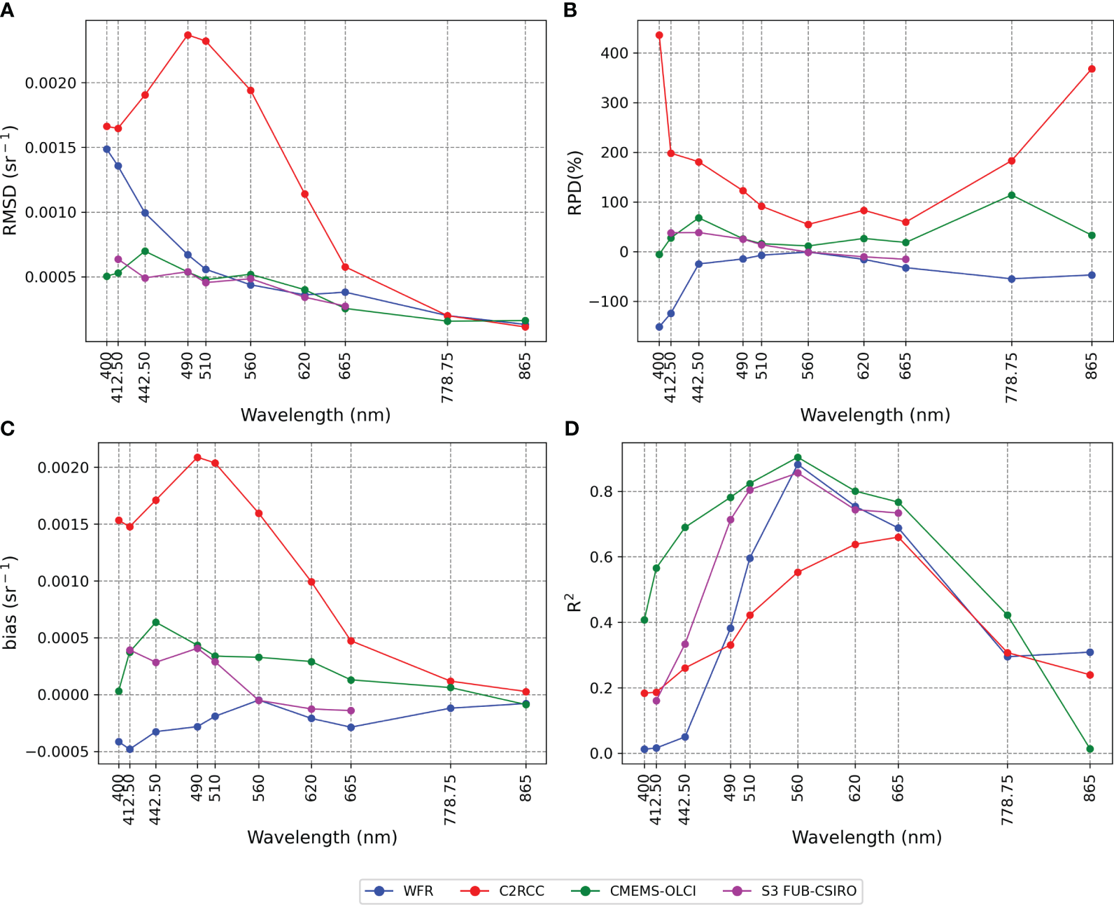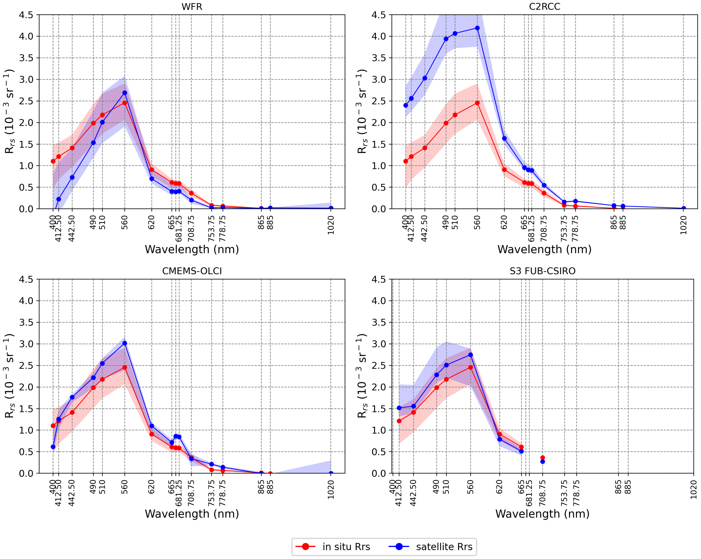 OLCI Rrs spectra were extracted from Sentinel-3 level-2 products processed by four different atmospheric correction algorithms: OLCI level-2 Water Full Resolution (WFR), POLYMER, Case 2 Regional CoastColour (C2RCC), and S3 FUB-CSIRO Coastal Water Processor (hereafter S3 FUB-CSIRO). All the level-2 products were derived from a set of Sentinel-3 level-1b Full Resolution (FR) images at 300 m resolution acquired over the Baltic Sea for both Sentinel-3A (between April 2016 and September 2022) and Sentinel-3B (between May 2018 and September 2022) missions.