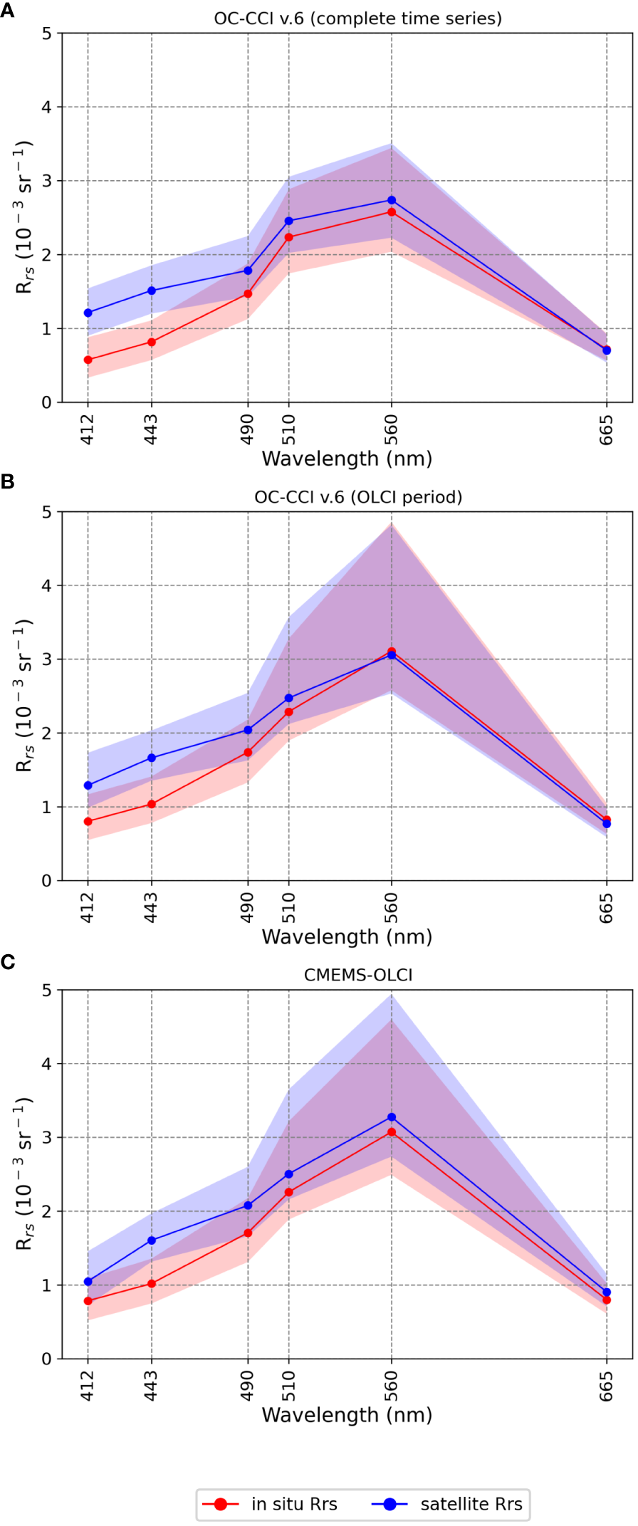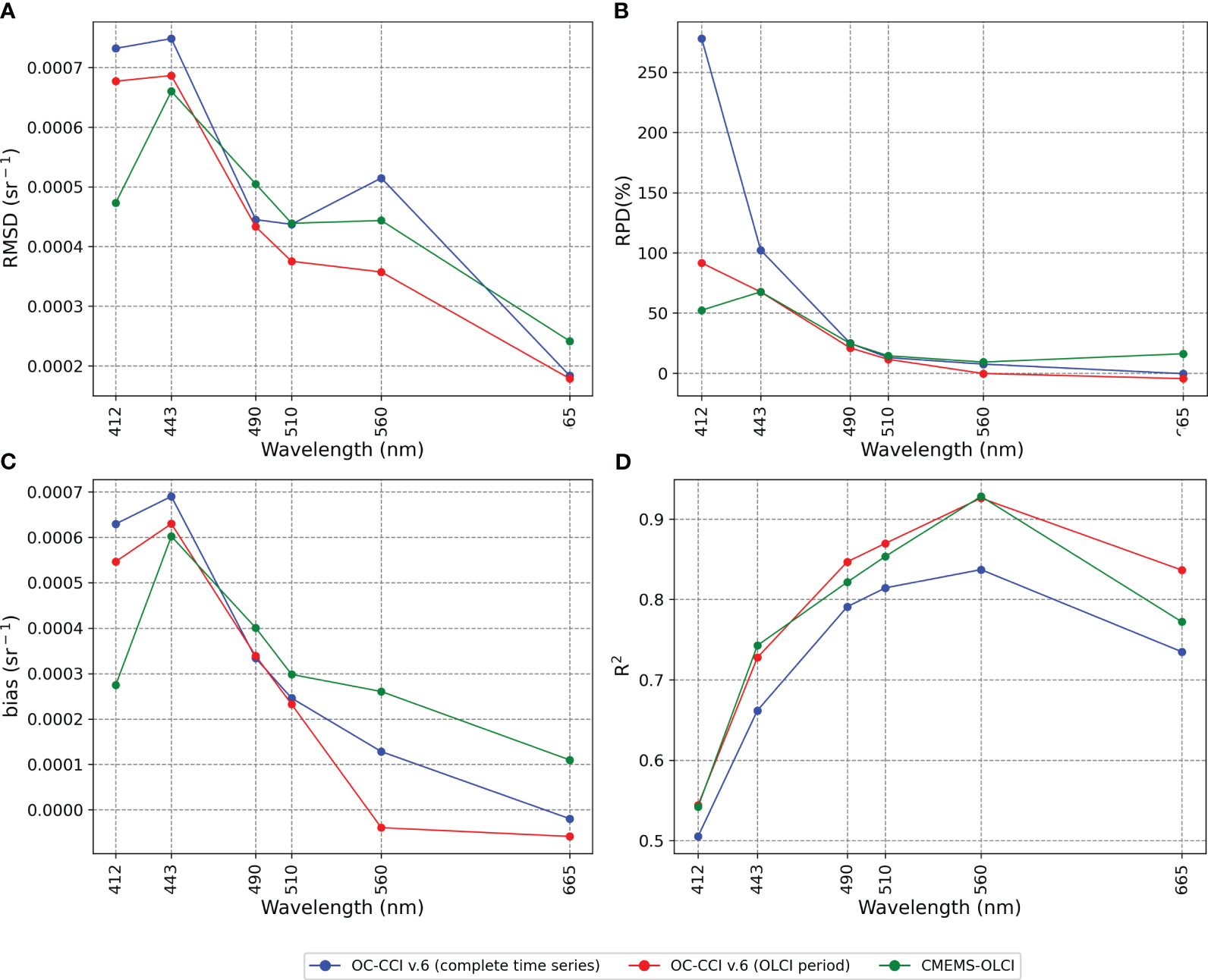 As chl-aENS3 was developed considering the SeaWiFS spectral bands available in the OC-CCI v.4.2 product, in this work, chl-a retrievals using Rrs values from CMEMS-OLCI or OC-CCI v.6 required a previous band shift to the SeaWiFS spectral bands. The band shift was performed through the inverse and direct application of the QAA algorithm (Mélin and Sclep, 2015; Lee et al., 2009) modified to ensure non-negative phytoplankton at any band (Brando et al., 2021).