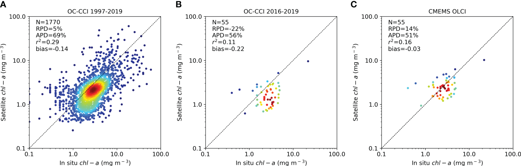 Brando et al. (2021) tested two ensemble solutions based on four (chl-aENS4: chl-aMLP_6b, chl-aMLP_5b, chl-aMLP_4b, chl-aMLP_3b) and three (chl-aENS3: chl-aMLP_5b, chl-aMLP_4b, chl-aMLP_3b) MLP algorithms, evaluating their performance through a match-up analysis of chl-a retrievals from OC-CCI v4.2 time series against in-situ chl-a concentrations. Results showed that both ensemble solutions outperformed all the band-ratio regression algorithms based on Rrs spectral slopes instead of Rrs values at different bands and that chl-aENS3 outperformed chl-aENS4.