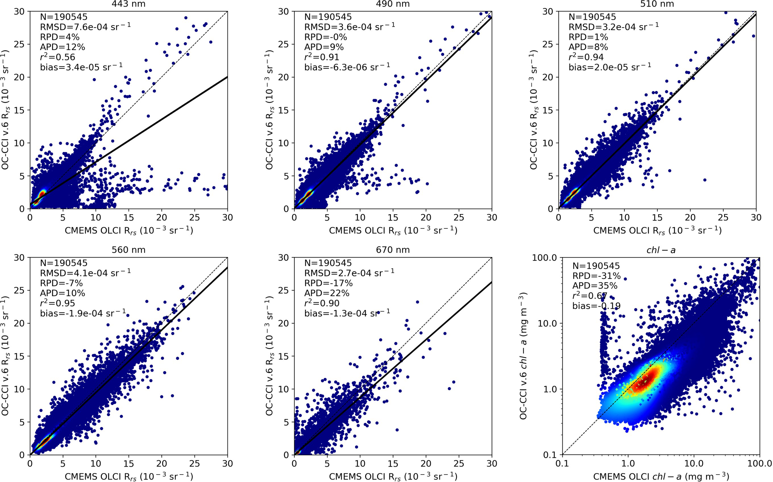 Chl-aENS3 was also the selected algorithm for the implementation of the new CMEMS-OLCI level-3 chl-a dataset for the Baltic Sea (OCEANCOLOUR_BAL_BGC_L3_MY_009_133, 2023; OCEANCOLOUR_BAL_BGC_L3_NRT_009_131, 2023), in which chl-a concentrations are retrieved from the CMEMS-OLCI level-3 Rrs dataset merging Rrs outputs from POLYMERv.4.14 (see Section 2.2.1). The new dataset was produced by CNR for the complete OLCI time series (from April 2016 to the present).