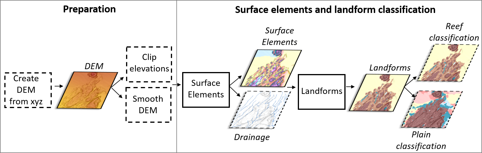 | Plain classification (optional) | Step 9 plain landforms | BPI (Slope Position, GGMT); Classify Terrain (BTM) |