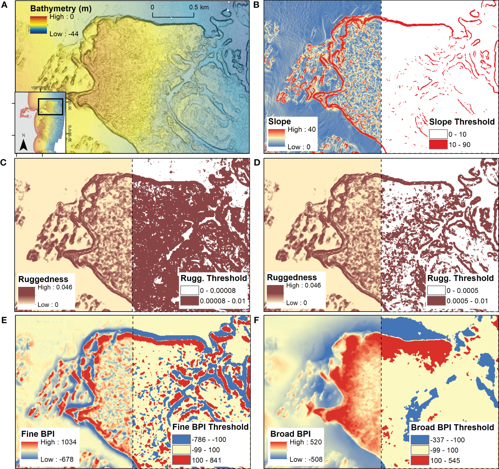 The thresholds to define the surface elements are user-defined, with settings dependent on the resolution and extent of bathymetric data, as well as features of interest. Default settings of the tools are presented in Table 4. These were developed for data inputs of 5 m cell size with three smoothing iterations. The default settings were chosen as they are suitable for the NSW statewide marine lidar and multibeam datasets, but are also representative of common input bathymetry datasets, which will often require smoothing. The 5 m cell size is a mid-level resolution for bathymetric datasets and an appropriate resolution for reef mapping at comparable scales (e.g. Lucieer et al., 2016). These thresholds have been modified where required for each of the datasets presented.