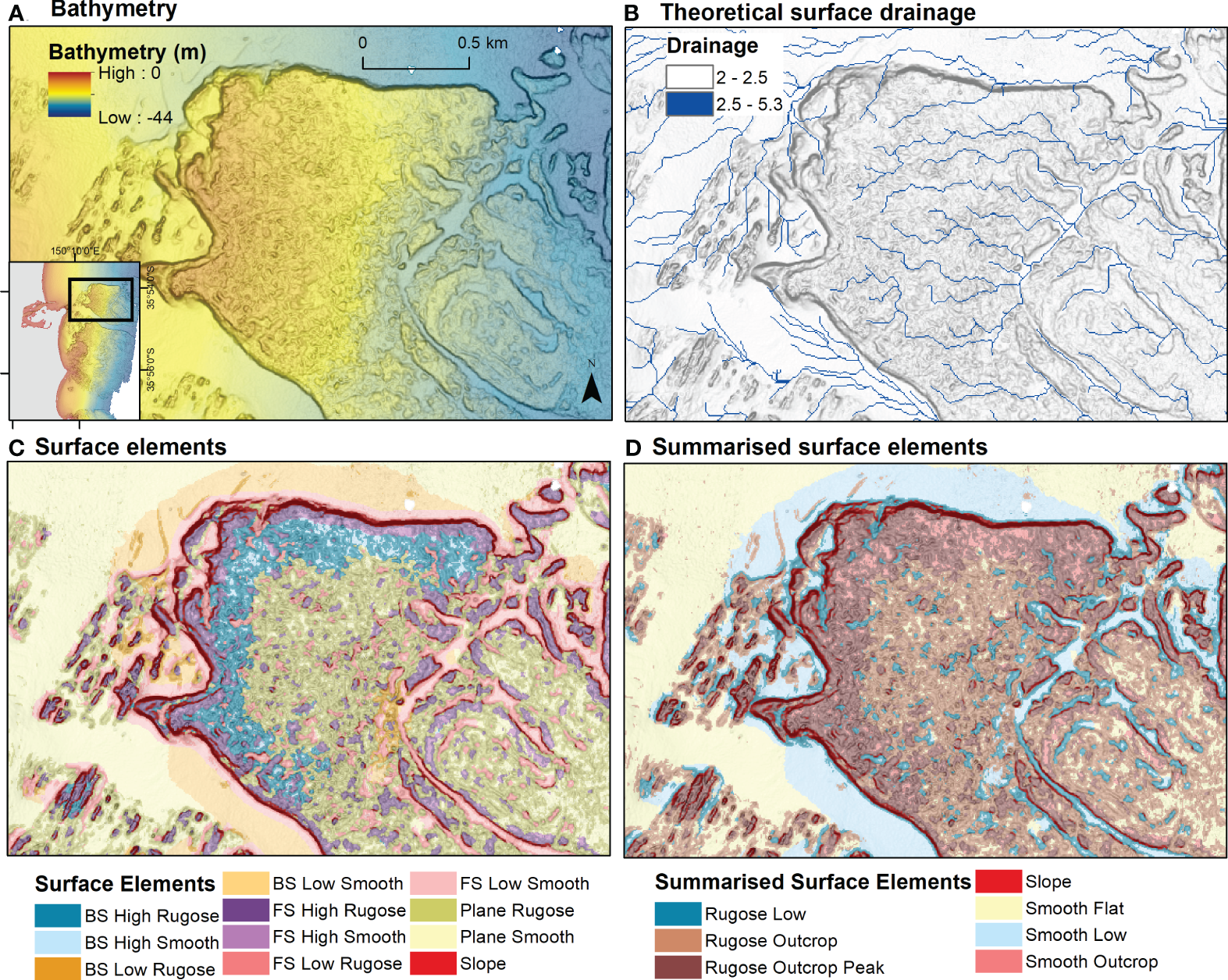 The surface elements classification outputs 11 classes characterising the surface based on superimposed reclassifications of ruggedness (rugose or smooth), broadscale and finescale BPI (finescale or broadscale high, low or flat) and slope (high slope) variables (Supplementary Table 2). Areas defined by the user as ‘slope’ (for example, all areas greater than 10 degrees with a user-defined threshold of 10) overrides all other classes. The remaining area of the surface, which are slope areas below the user-defined threshold, are classified based on ruggedness and BPI. These 11 classes are in turn aggregated into 7 classes to create a summarised surface elements layer including: rugose outcrop, rugose outcrop peak, smooth outcrop, smooth low, rugose low, smooth flat, and slope (Supplementary Table 2). The surface elements layer represents the full suite of component elements, while the summarised surface elements offer a more practicable layer for users to interpret features.