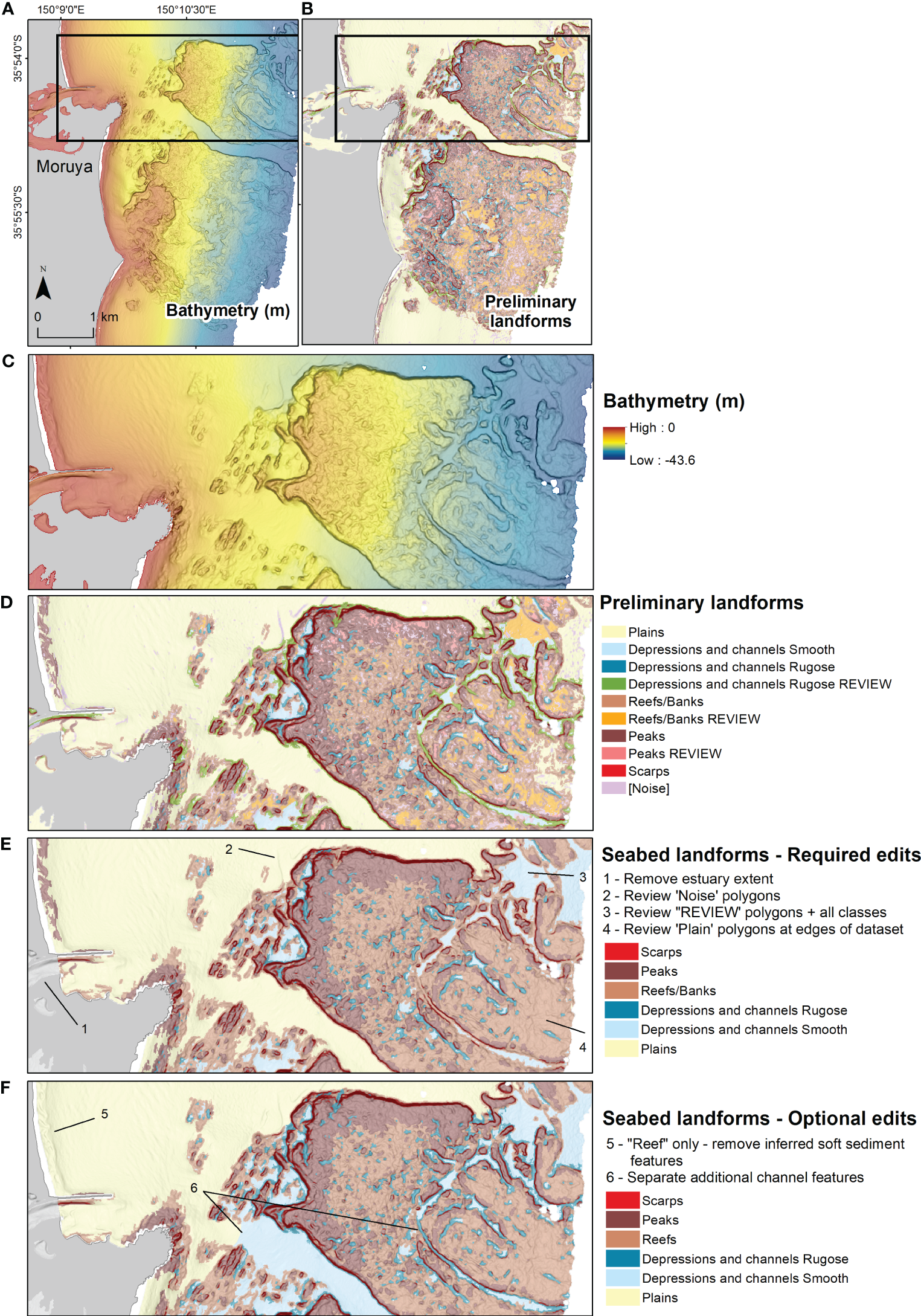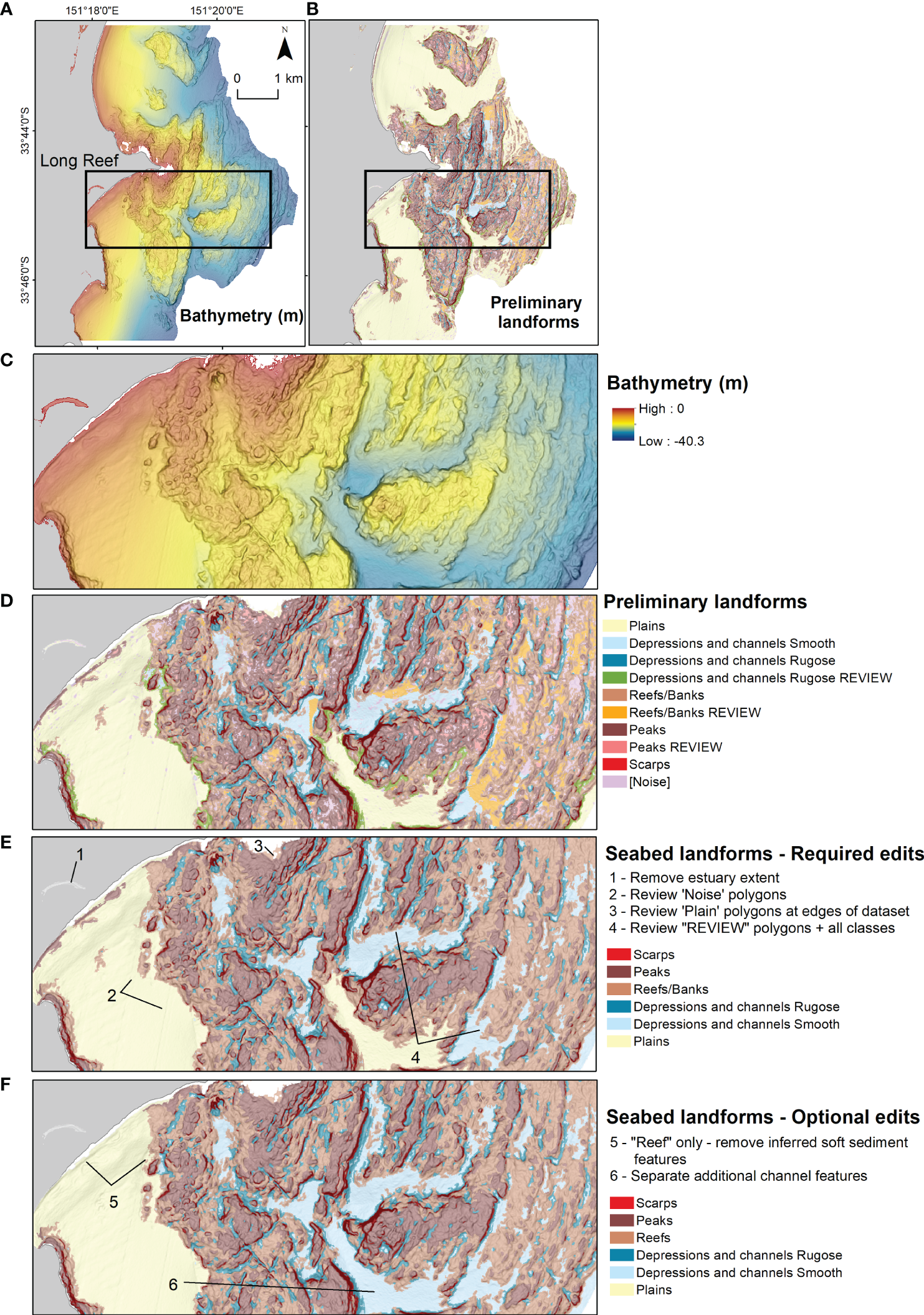 If desired, the user may seek to manually separate “reefs” from banks and other plain features (Figure 2). Although the landform classification isn’t intended to explicitly map substrate, inferred hard-substrate ‘reef’ areas could be distinguished from inferred soft-substrate ‘banks’ by the user using expert knowledge and manual editing, with examples of these optional edits presented in this study. Further separation of the classes defined in the toolset, including “reef/bank” outcrops and “depressions and channels” into more detailed morphological terms or regionally specific terms is encouraged where desired by the user.