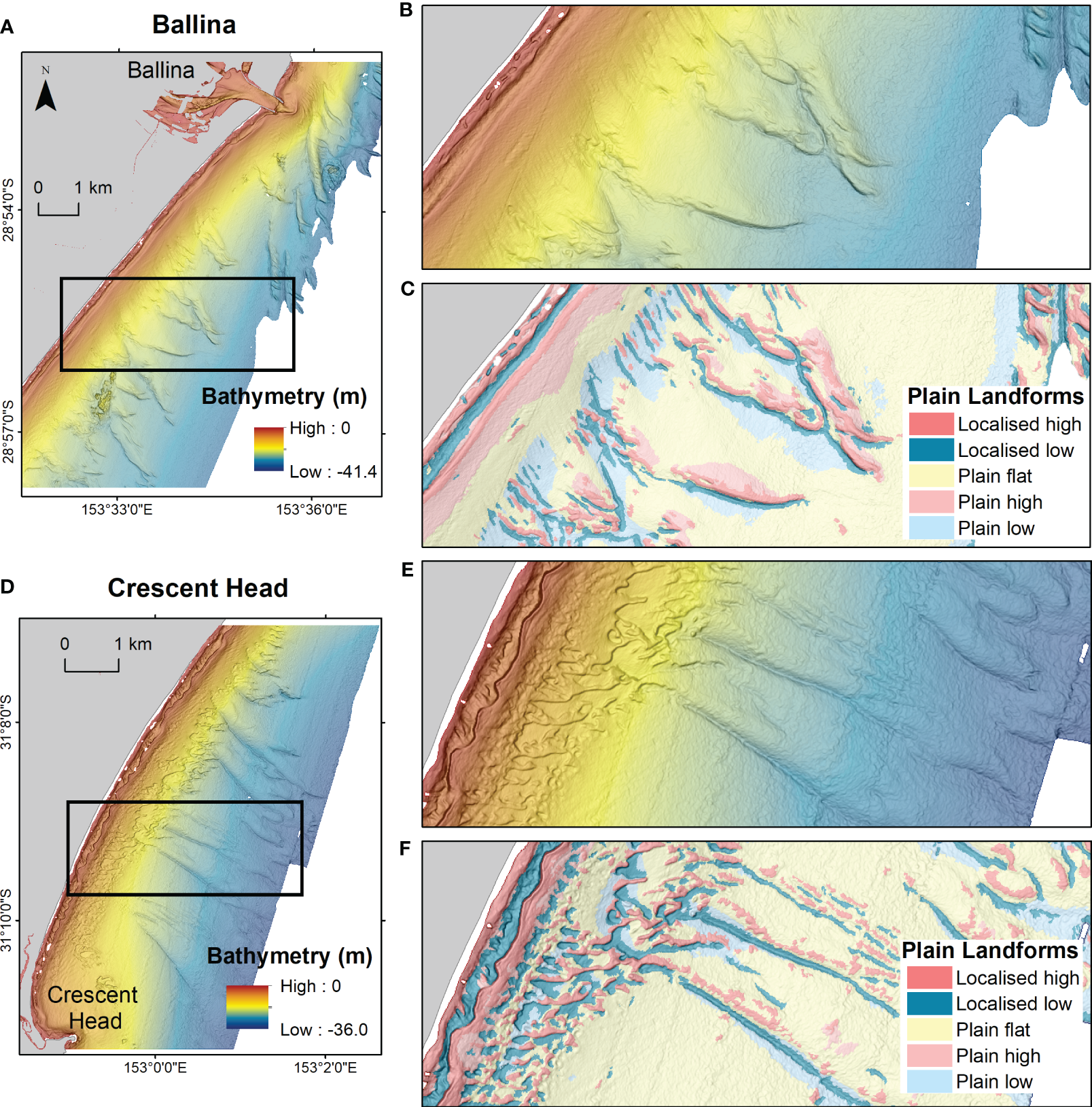 Feature terms utilised in the plain classification (e.g. localised high) are intentionally generic so the user can apply or describe features based on site specific interpretations. “Low” features in the plain classification are similar to the “depressions and channels” features in the main landform classification in that they are both defined using BPI. However, “depressions and channels” in the main landform classification are characterised as occurring within rugose outcrops, and broadscale and finescale low classes are combined. In the plain classification, finescale (localised) and broadscale high and low features are retained, and ruggedness and slope variables are removed as they were determined as less effective at capturing the detailed surface variation of generally smoother plain environments.
