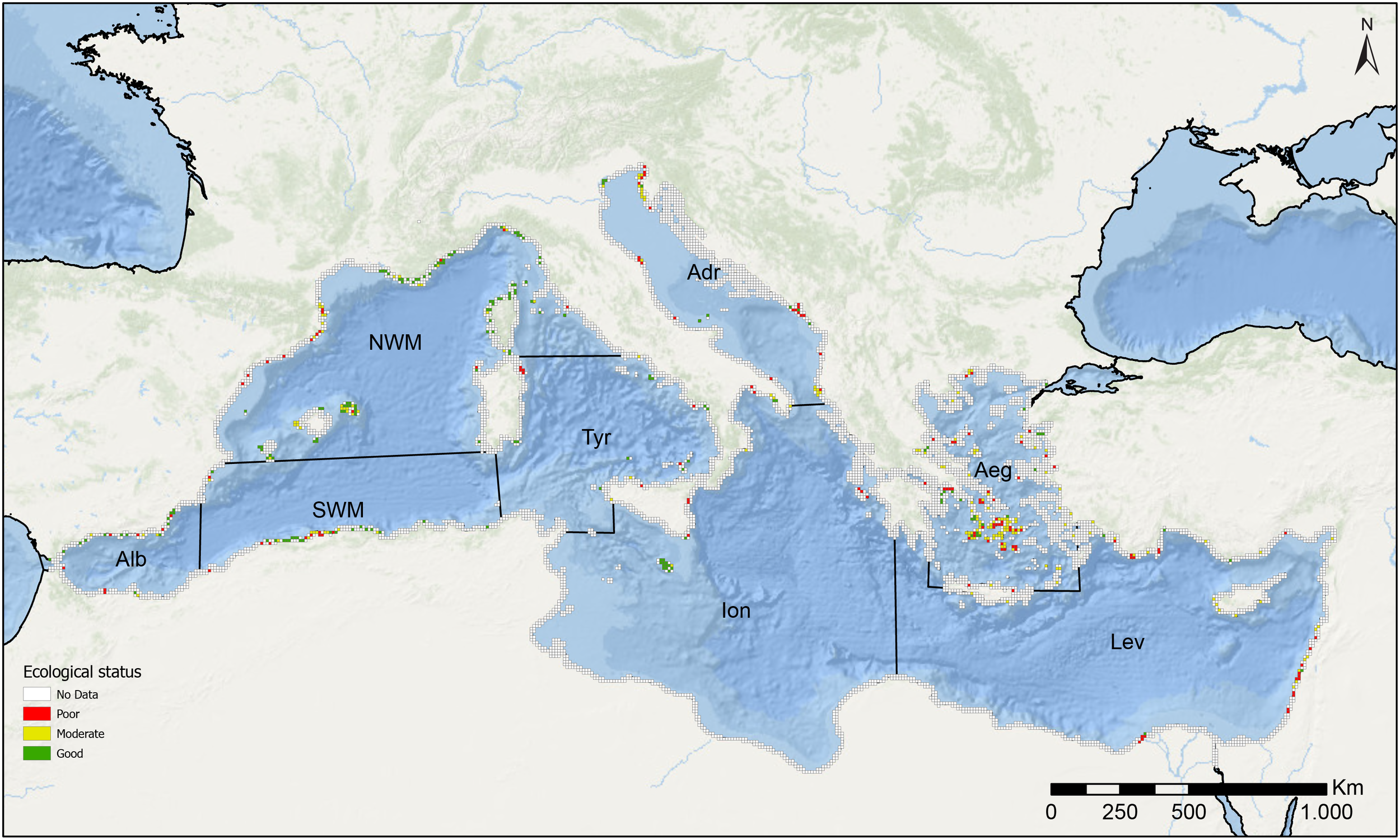 Ecological status. Distribution of the sampling points reporting information regarding the ecological status of Cystoseira s.l. populations along the Mediterranean basin that have been obtained in the data extraction process. Each square encompasses an area of 10 km2, the colour of which shows the mean ecological status of the different points within the given area. The mean ecological status value has been obtained from the average value of the ecological status of the different sampling points that are located within the area of each square. The different divisions represent the Mediterranean sub-basins defined in this study (modified from Terruzi et al., 2011): Alb: Alboran Sea, NWM: North-Western Mediterranean, SWM: South-Western Mediterranean, Tyr: Tyrrhenian Sea, Adr: Adriatic Sea, Ion: Ionian Sea, Aeg: Aegean Sea, Lev: Levantine Sea.