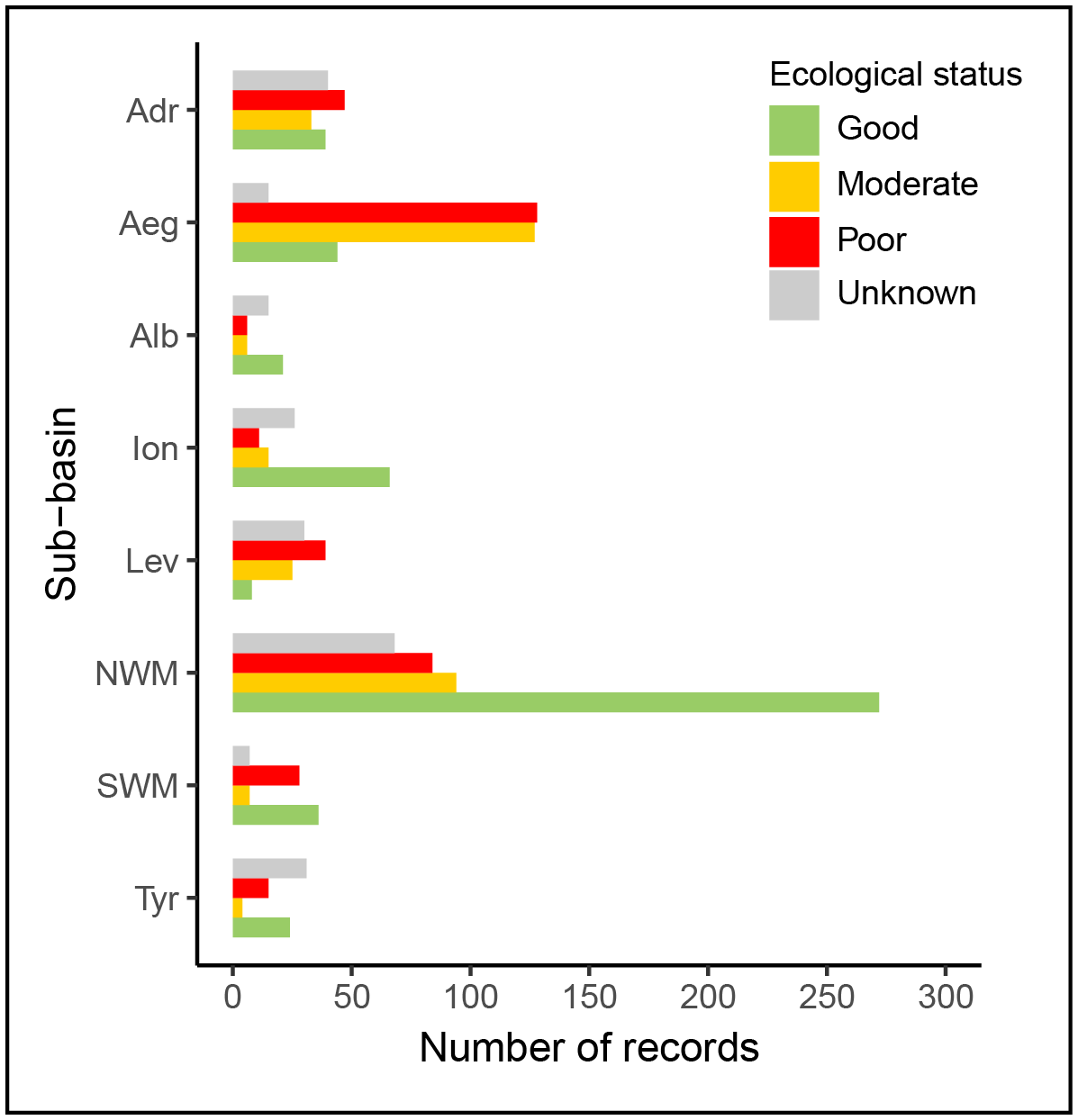 Number of points reporting the past or present presence of Cystoseira s.l. forest in the different sub-basins classified within the different categories of ecological status (Good, Moderate and Poor), based on the extracted data. Those points reporting the presence of Cystoseira s.l. forest but not mentioning the ecological status of the forest are classified within “Unknown” category in the graph. Alb: Alboran Sea, NWM: North-Western Mediterranean, SWM: South-Western Mediterranean, Tyr: Tyrrhenian Sea, Adr: Adriatic Sea, Ion: Ionian Sea, Aeg: Aegean Sea, Lev: Levantine Sea.