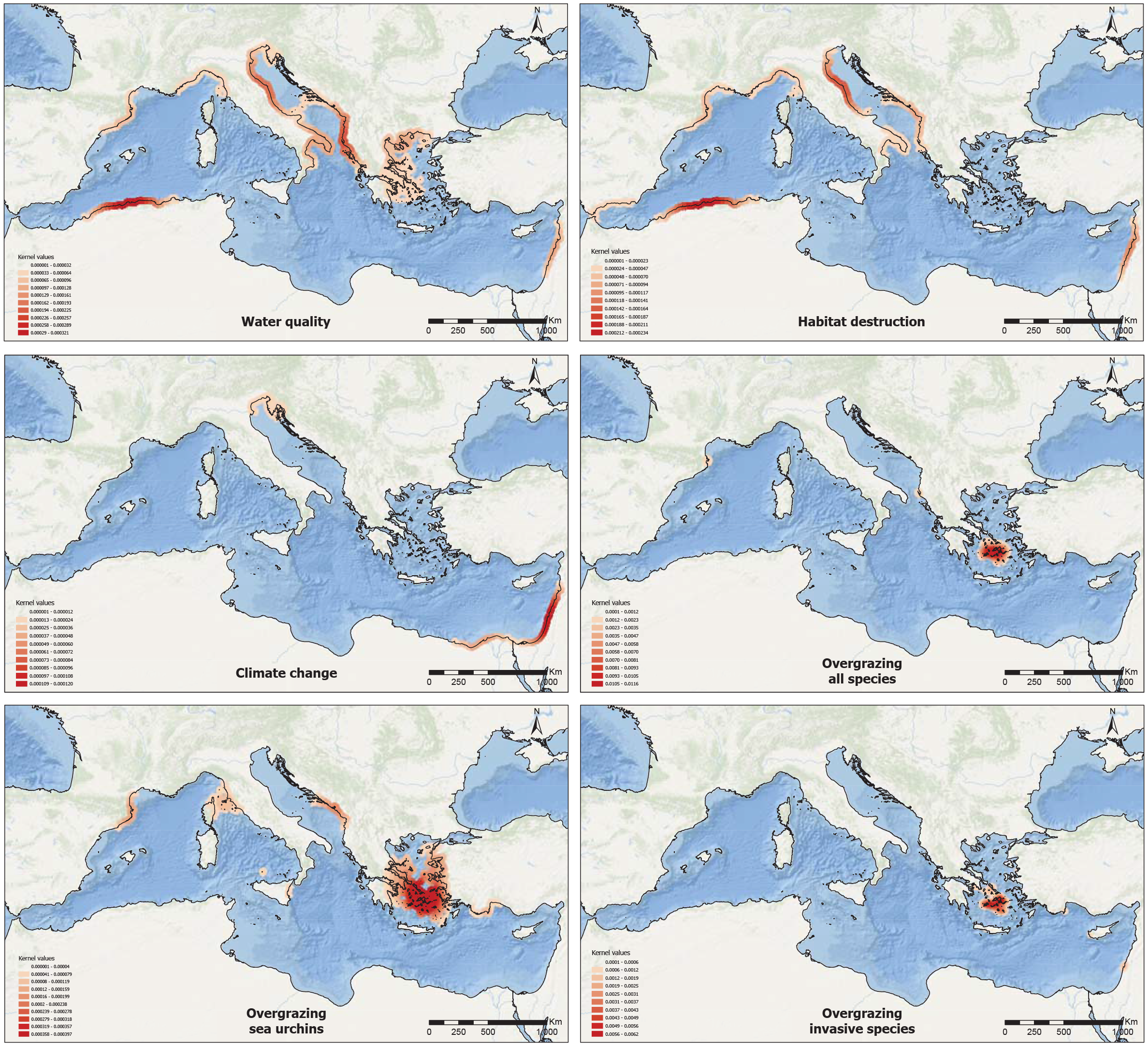 Stressors. Kernel density map of the main reported stressors of Cystoseira s.l. population along the Mediterranean Sea, based on the available data. The red colour on each map indicates the highest density associated with the areas with the highest reporting frequency and intensity of each stressor, from left to right and from top to bottom: Water quality, Habitat destruction, Climate change, Overgrazing by all species, Overgrazing by sea urchins and Overgrazing by invasive fish species. It is important to note that areas depicted as lacking a specific stressor do not necessarily indicate its absence, as this outcome may also be attributed to the lack of documentation of the said stressor.