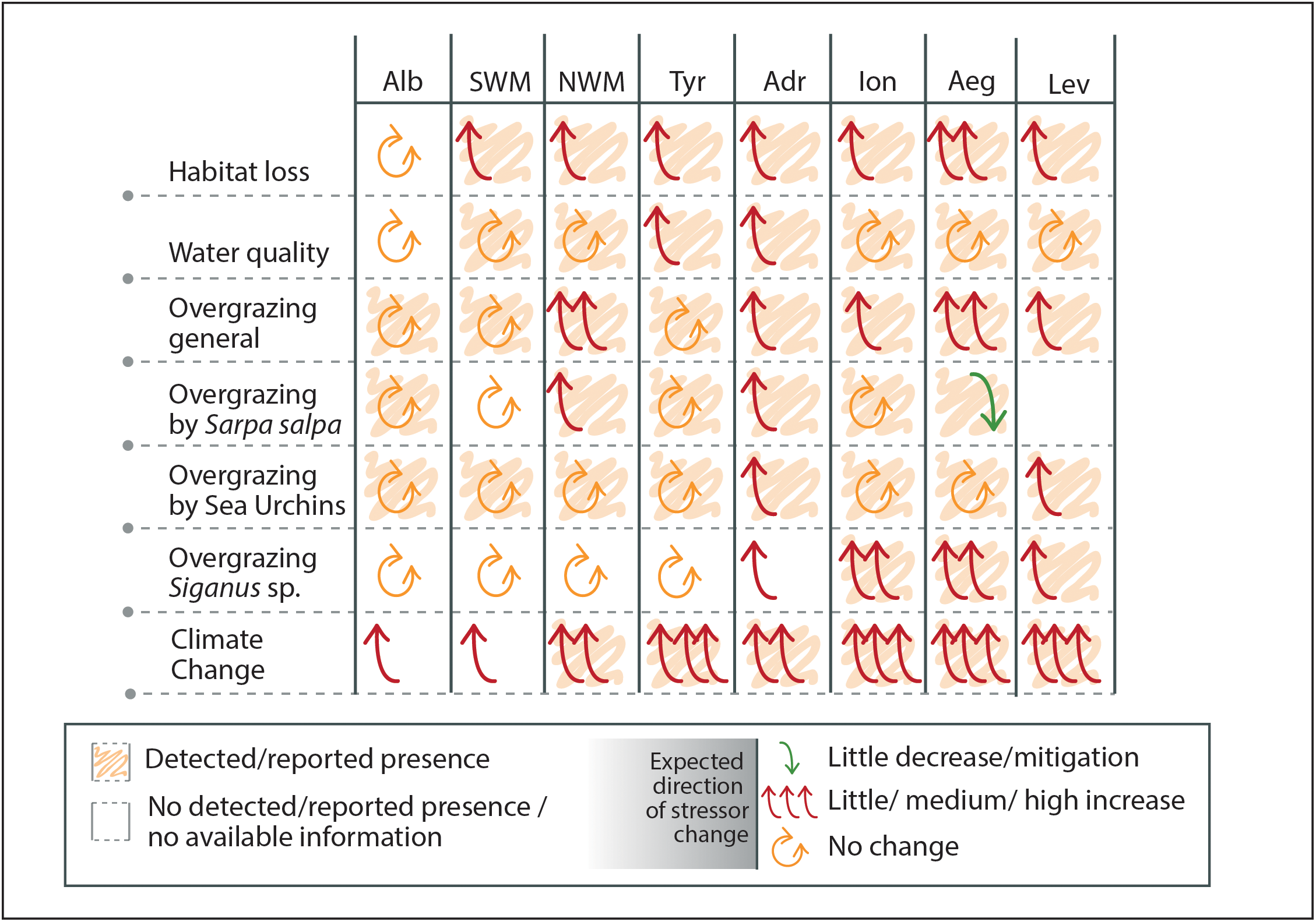 In terms of stressor presence and their expected impacts, none of the sub-basins is expected to witness an amelioration in any of the considered stressors, except for overgrazing by Sarpa salpa in the Aegean sub-basin, likely due to the out-competence with invasive fish species (Figure 6). Furthermore, there is a prevailing perception that the effects of global stressors will intensify across the entire Mediterranean Sea, with particular emphasis on the easternmost basins (Figure 6).