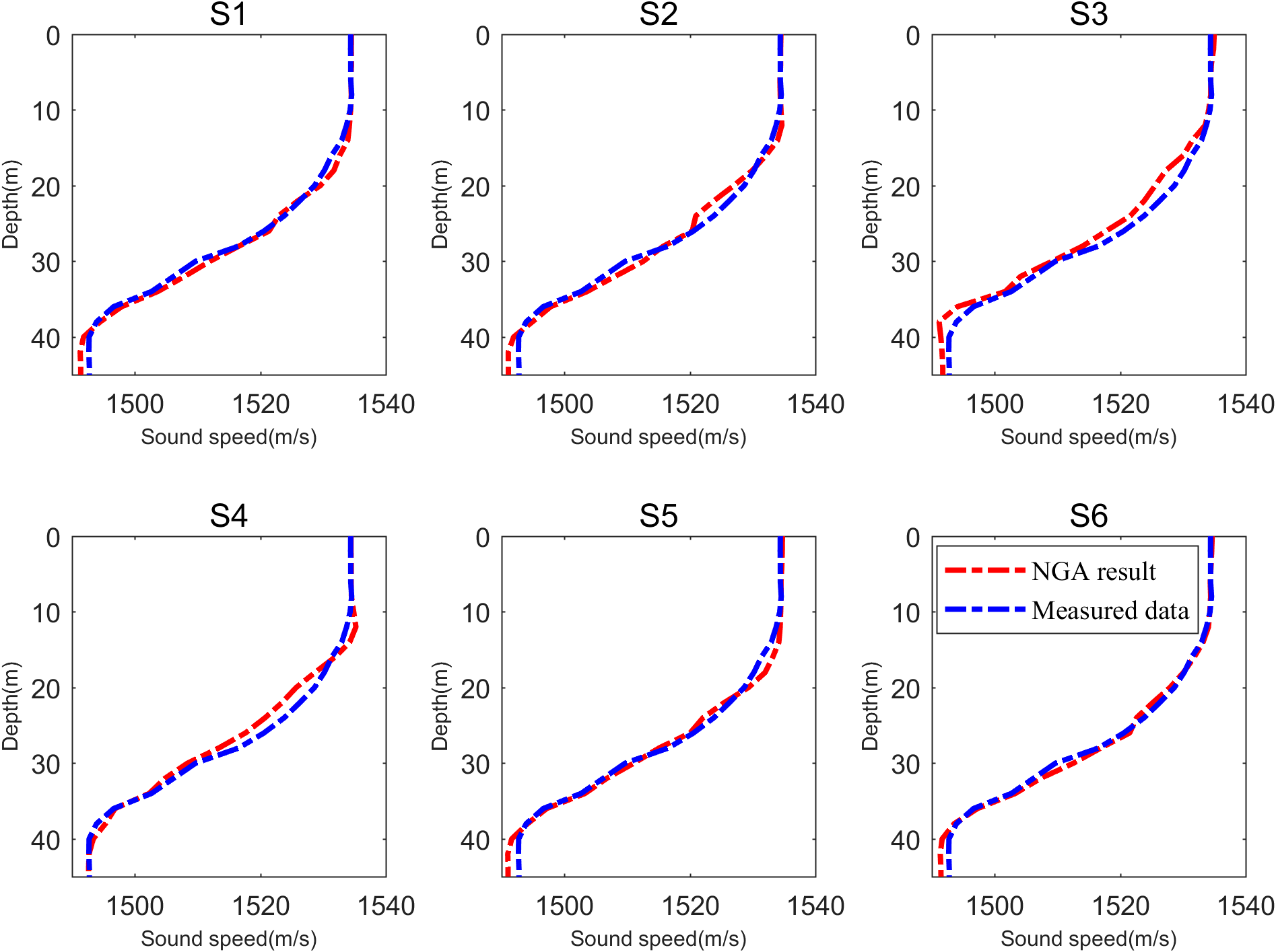 The SSP obtained from the experiments of 35m bombs at 6 release points (S1-S6) and measured data are selected as samples and shown in Figure 5. The measured data are XBT measurement from launching and receiving vessels during the experiment. Due to the limited availability of salinity data (only 2 CTD measurements per buoy), the salinity profile is assimilated with measured data based on ROMS dataset, shown in Figure 6A. The average SSP of OAT is shown in Figure 6B. Consequently, the temperature profile is extracted using OACM and illustrated in Figure 6C. Figure 6 reveals that the biases primarily originate in the thermocline depth, while the biases in the sea surface mixed layer and deeper layers are relatively smaller. Root Mean Square Error (RMSE) for SSP and temperature profile is calculated to be 1.07m/s and 0.40°C, respectively. Specifically, RMSE in thermocline depth (15-40m) is 1.21m/s and 0.47°C. These results are considered accurate, taking into account the limited number of blast sources and the duration of the experiment. The findings suggest that NGA algorithm-based OAT can reliably invert the marine environment in Yellow Sea.