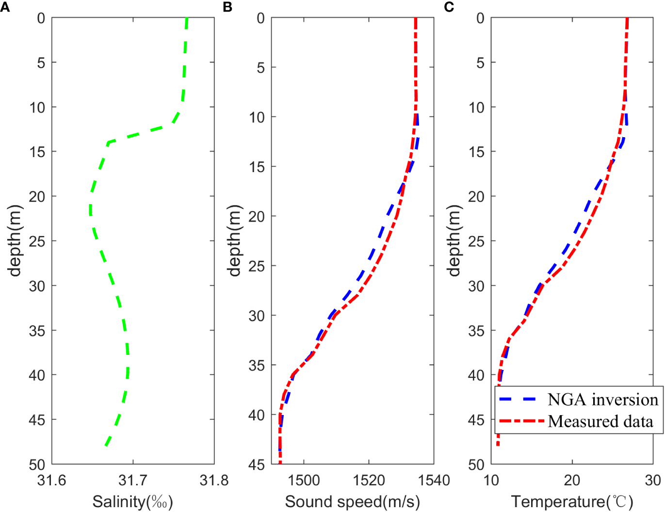 Results of OAT inversion. (A) Salinity profile after assimilation with measured data based on ROMS dataset, (B) Comparison of average SSP obtained from OAT and measured data, (C) Comparison of average temperature profiles obtained from OAT and measured data.