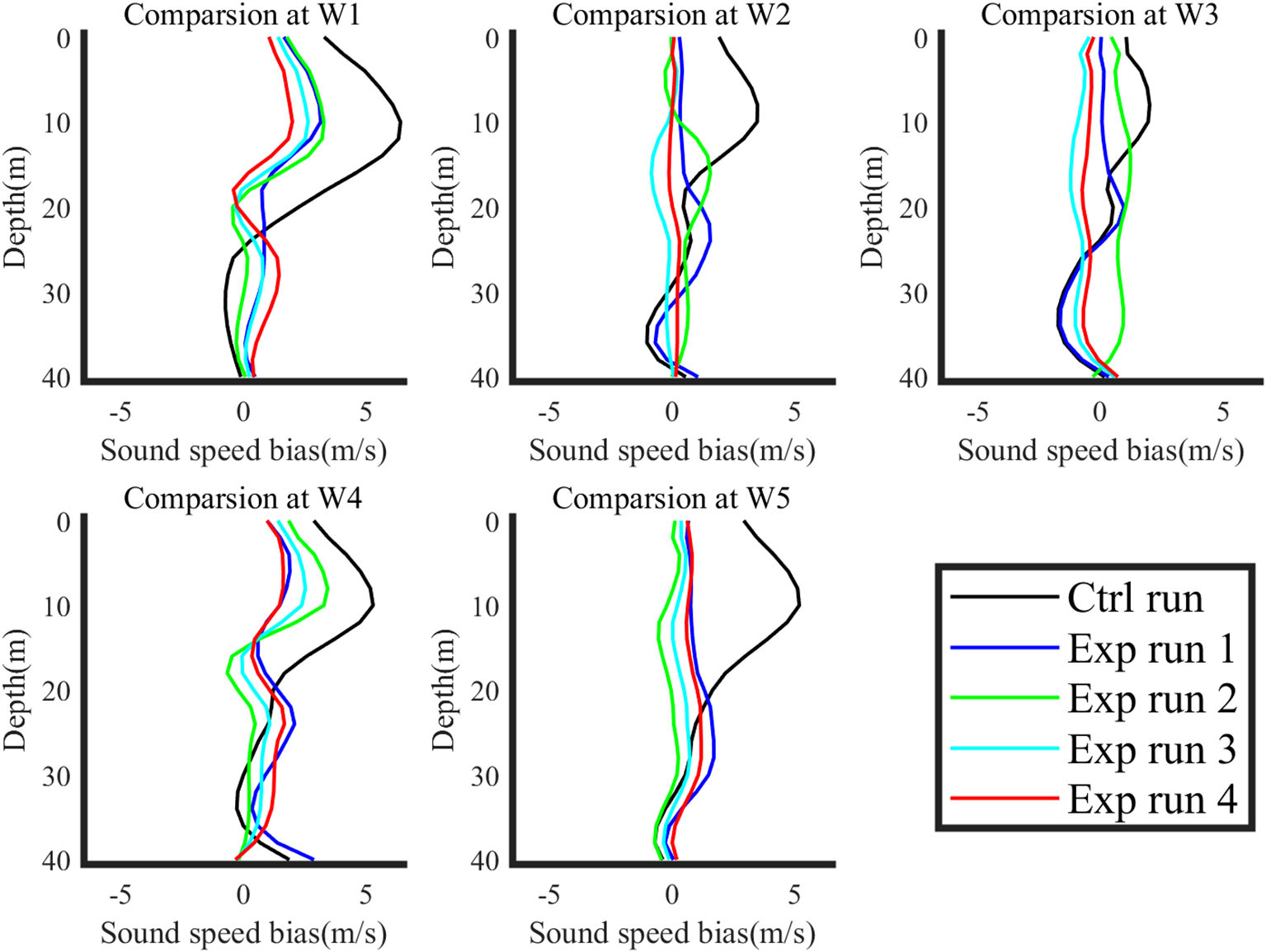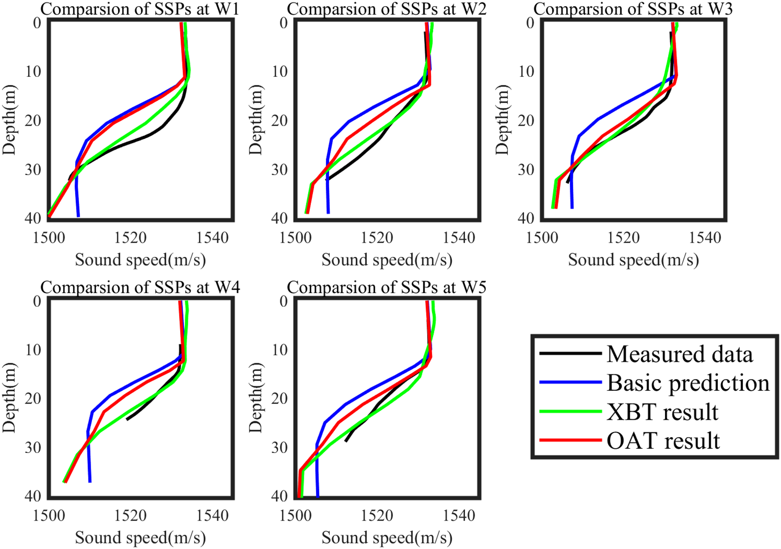 Comparisons of sound speed profile at different buoy station at verification time (day 7), including measured data (black line), basic prediction (blue line), assimilation results from XBT measured data (green line) and assimilation results from OAT inversion simulation data (red line).