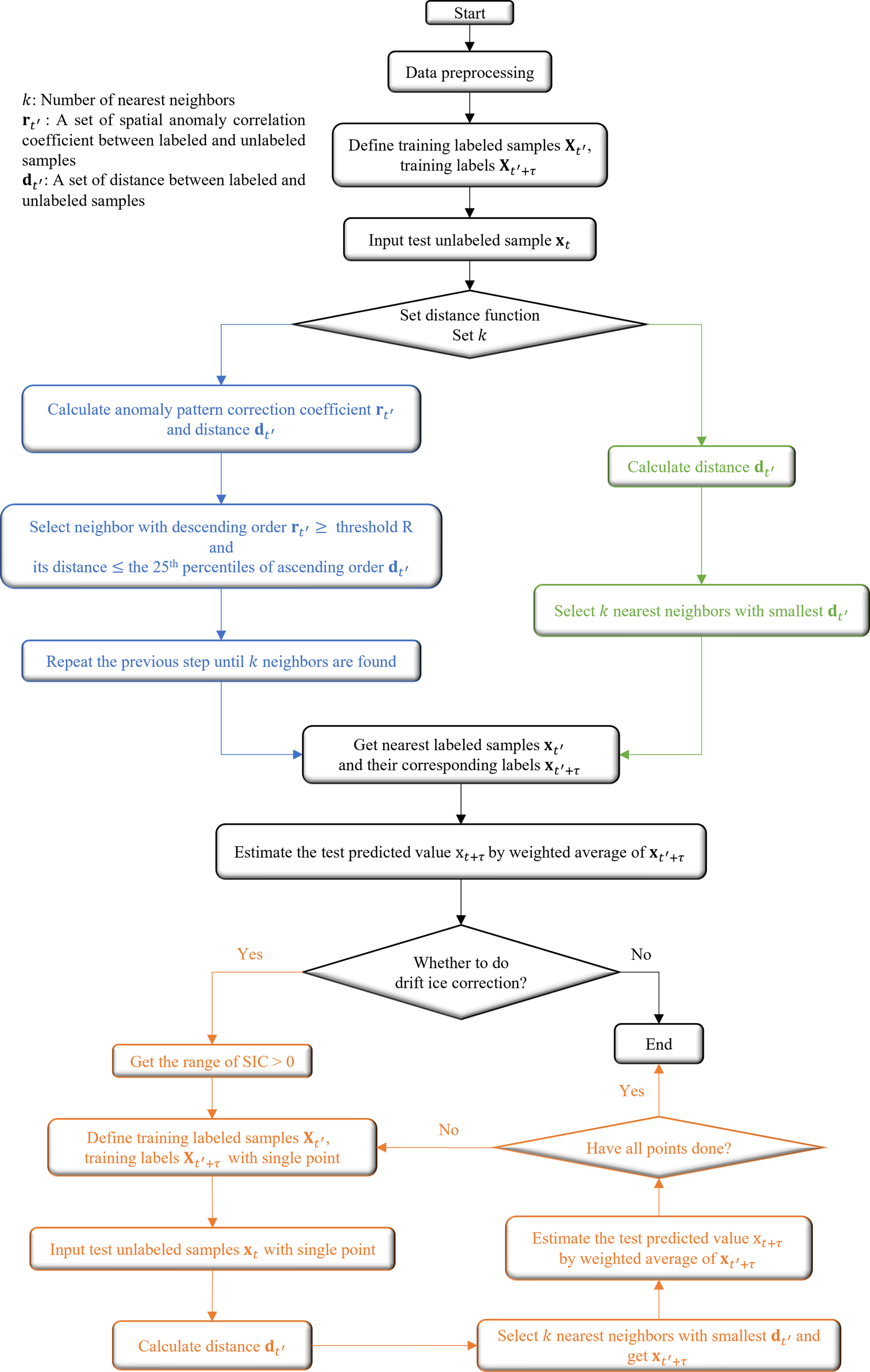 Fritzner et al. (2020) indicated that in the kNN model, the modelling of each point is independent of each other, leading to frequent occurrence of drift ice in the Arctic marginal region in the forecast results. Li et al. (2020) proposed a method that considers full-field distance of variables and thus the best similarity type can be found. This method considers the spatial correlation of variables to a certain extent and thus alleviating the drift-ice problem in pointwise prediction. Therefore, this study proposed two drift-ice correlation algorithms: Full_Field (Ice-kNN-F) and Full_Field_Plus_Pointwise (Ice-kNN-FP). In Ice-kNN-F, the sample was defined as the whole pattern of the sea ice concentration anomaly (SICA) rather than single point of SICA. In other words, the features of the sample are expanded. In Ice-kNN-FP, the kNN model first defined the sample as the whole pattern of the SICA to predict the sea ice edge location where SIC greater than 0, and then defined the sample as the grid point of the SICA to predict the SIC within the sea ice edge.