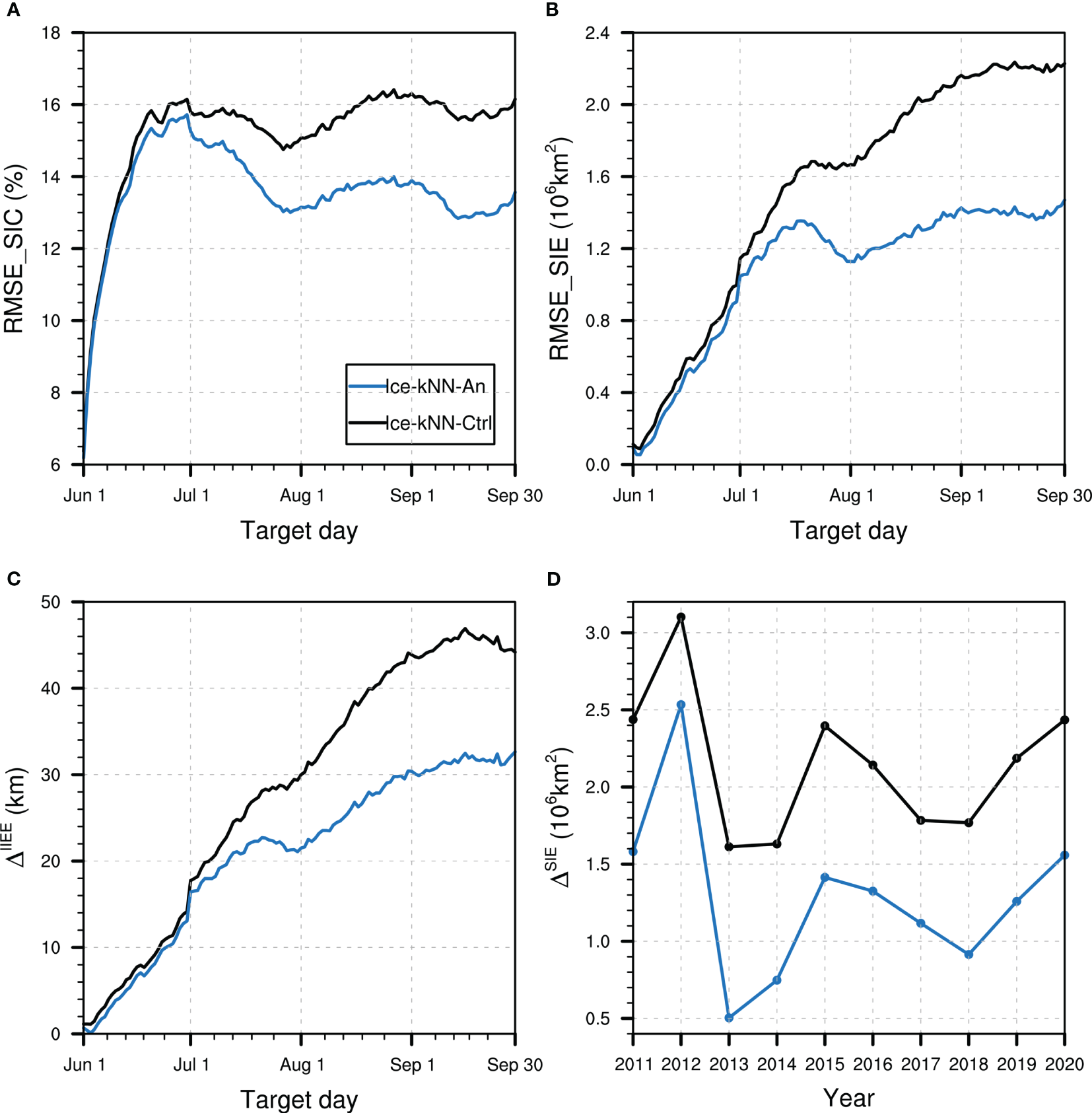 Hindcast skill comparison between Ice-kNN-Ctrl (black) and Ice-kNN-An (blue) measured by (A) spatial averaged RMSE_SIC, (B) RMSE_SIE, (C), and (D).